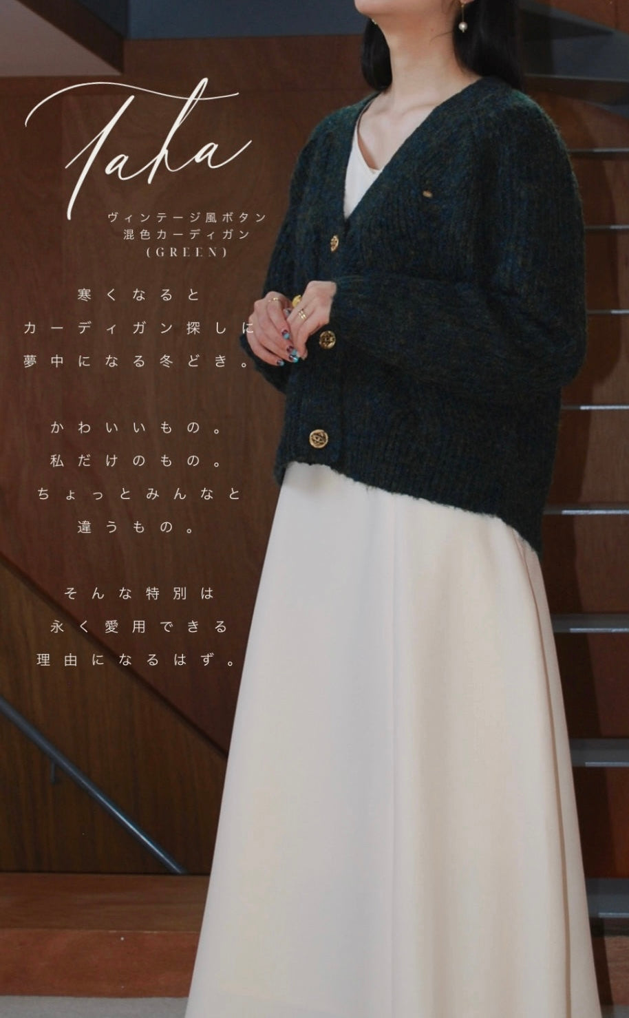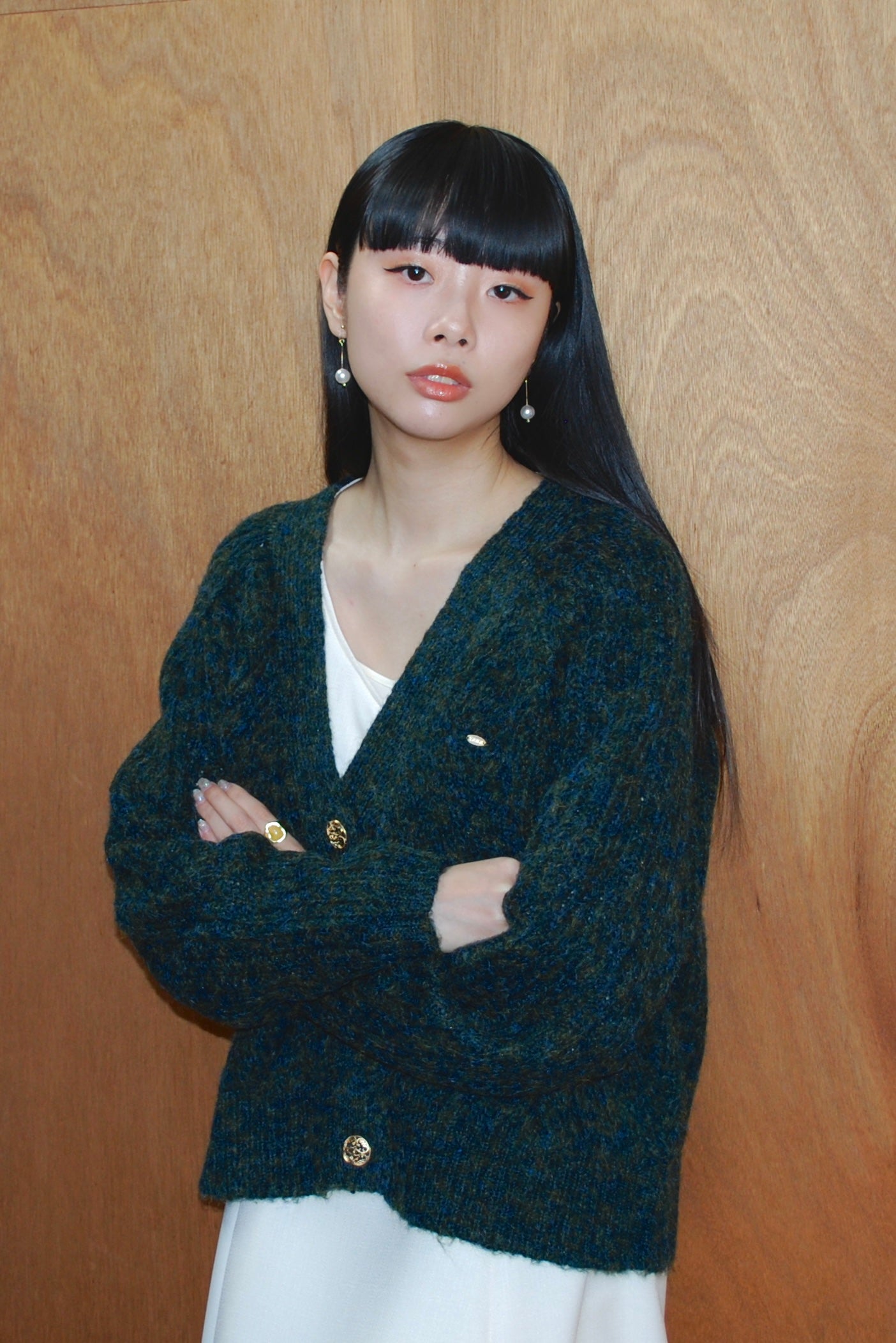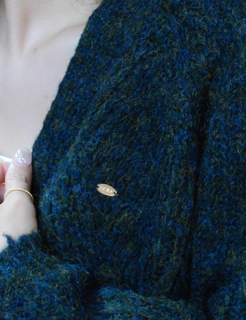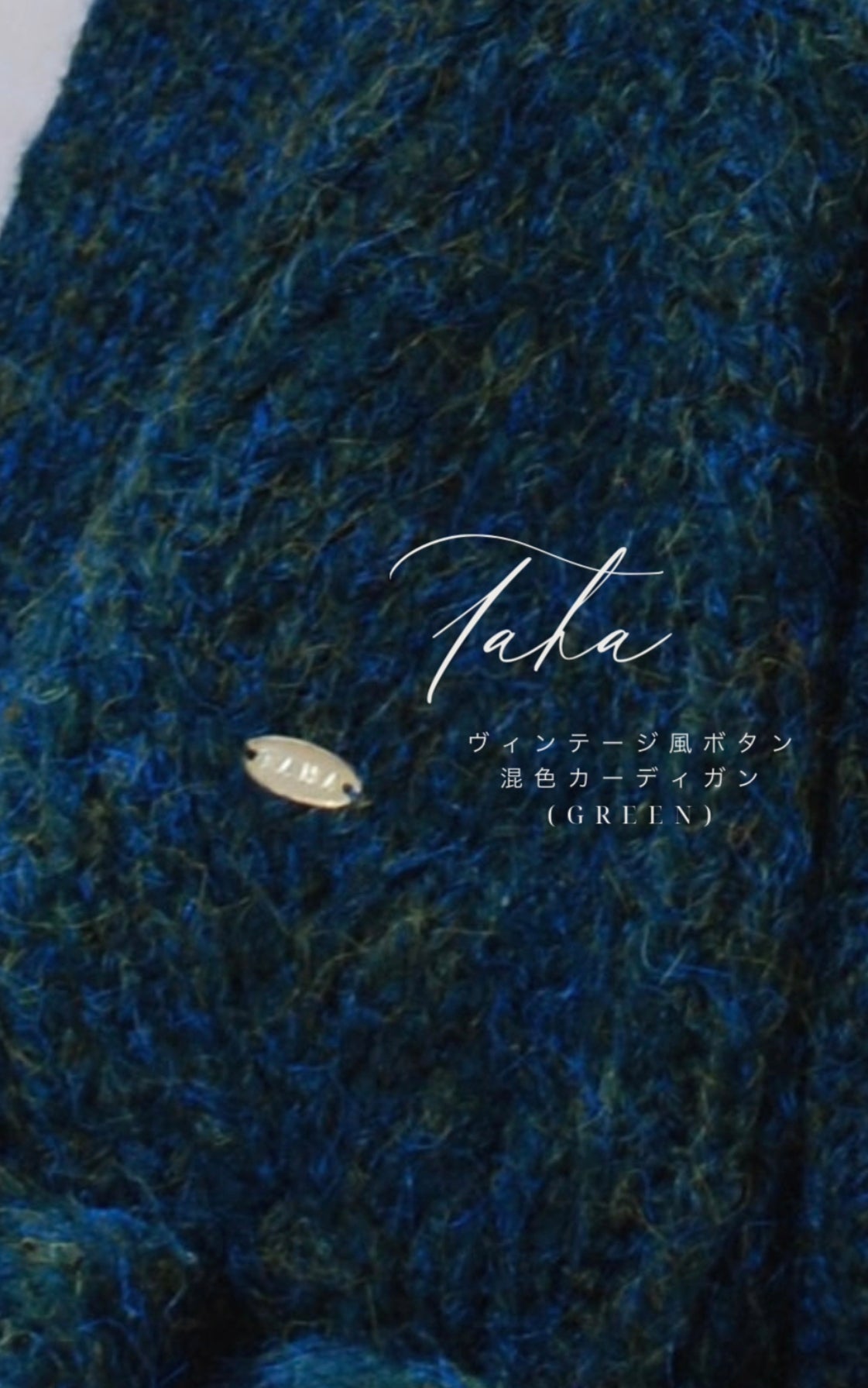 深い緑のカラーがベースのこちらのカーディガンは混色デザインなのがポイントです。釦はデザイナーが選別したものを国内でチェンジしリメイク。