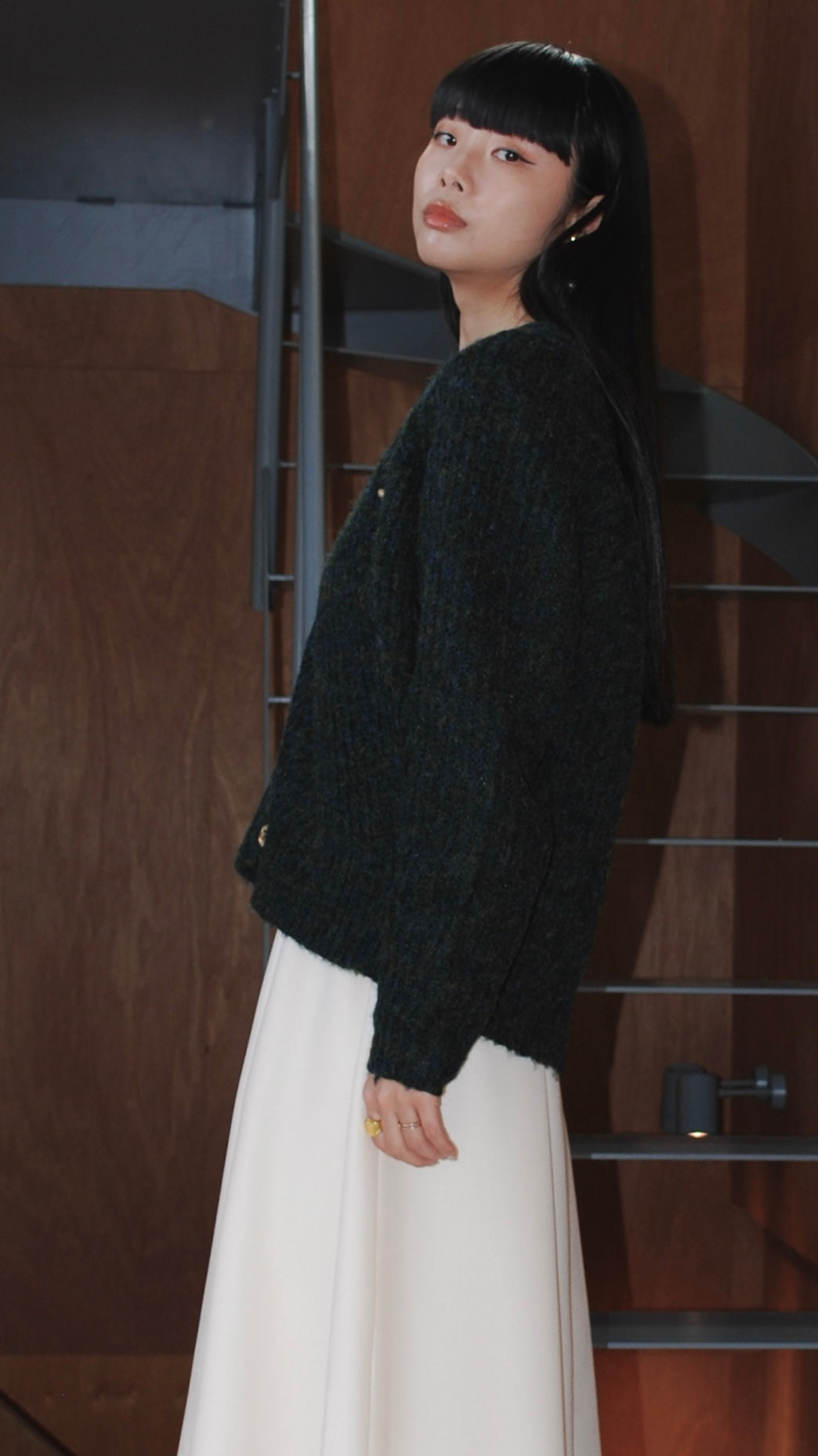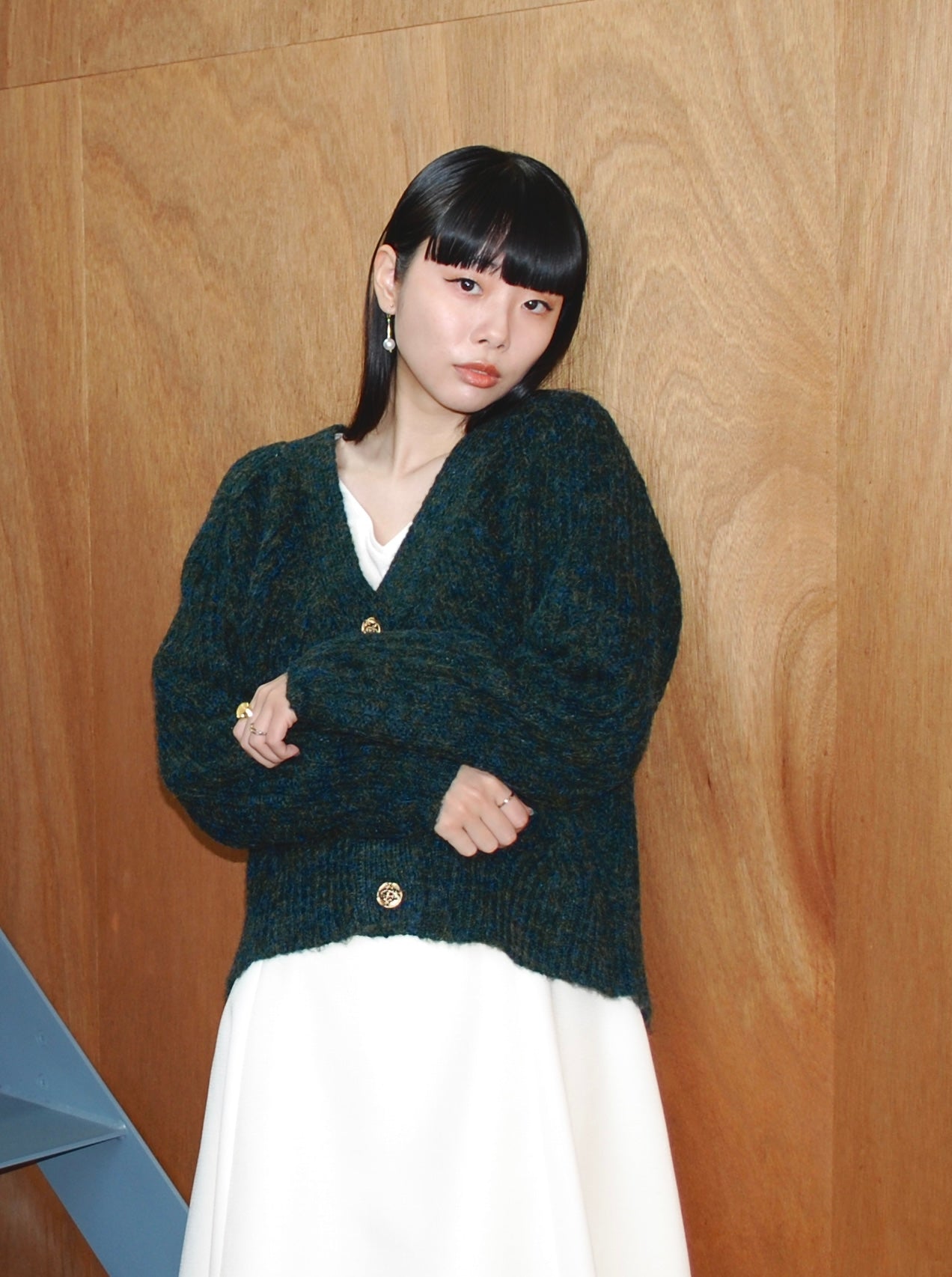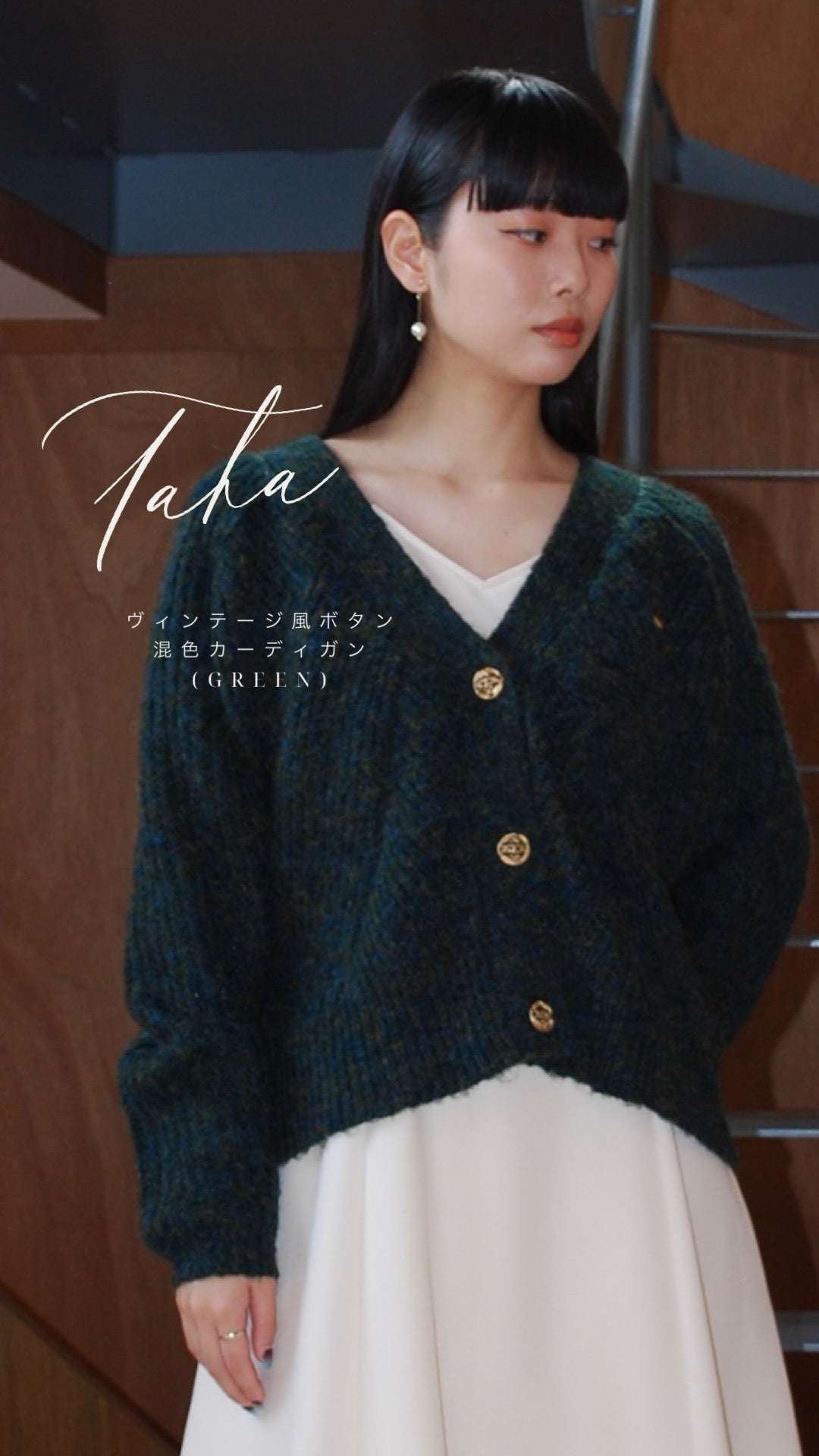 深い緑のカラーがベースのこちらのカーディガンは混色デザインなのがポイントです。釦はデザイナーが選別したものを国内でチェンジしリメイク。