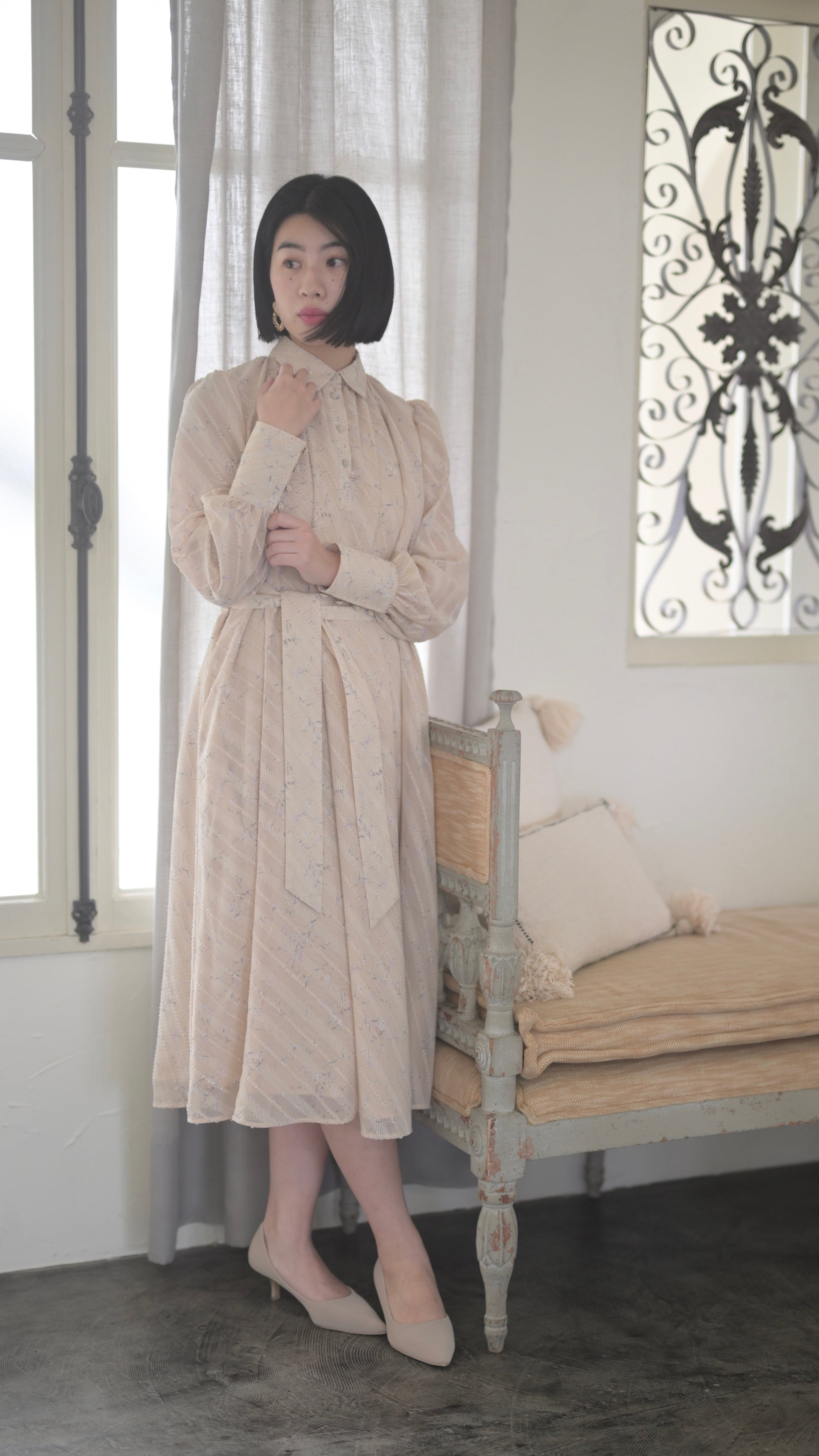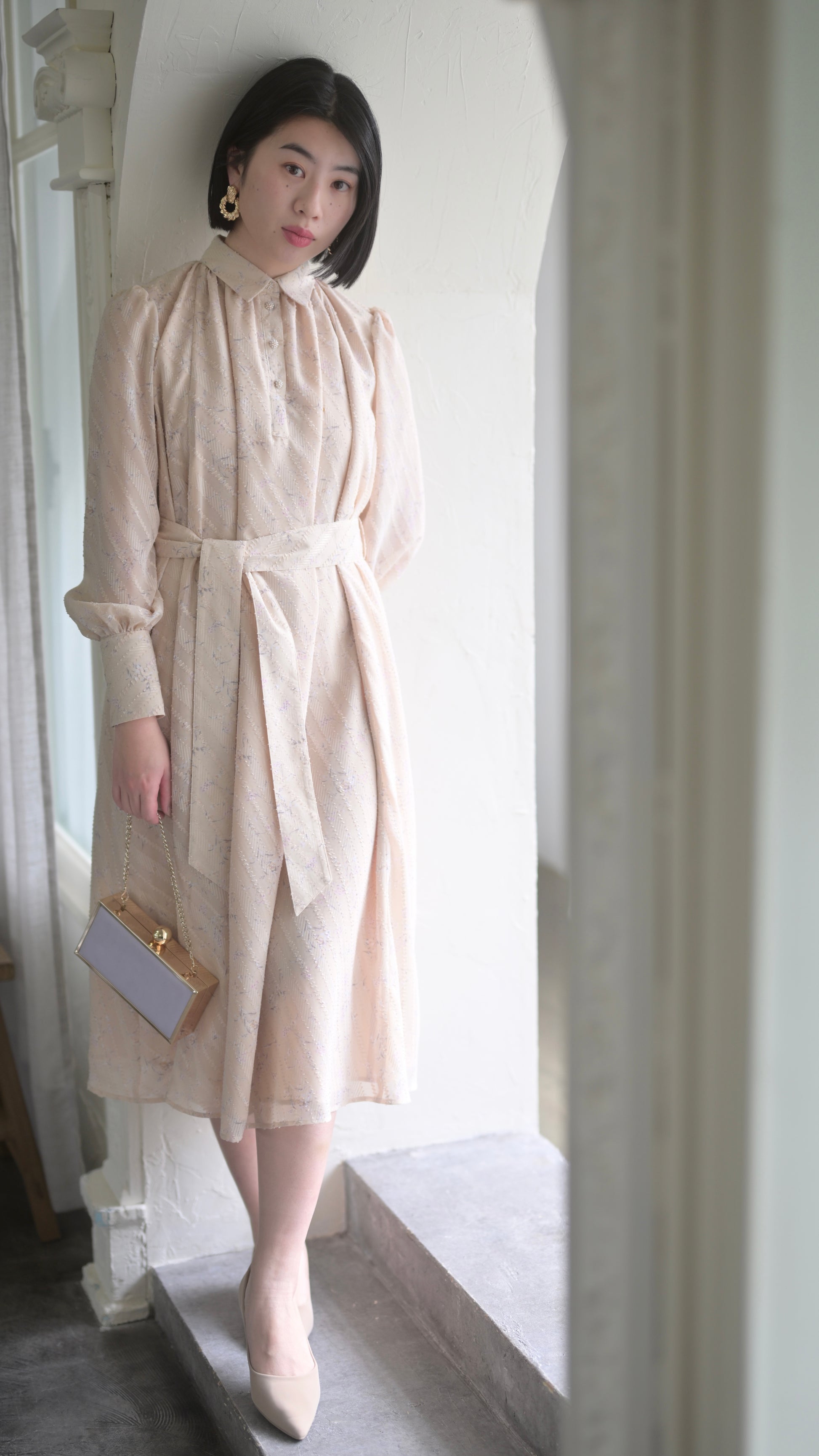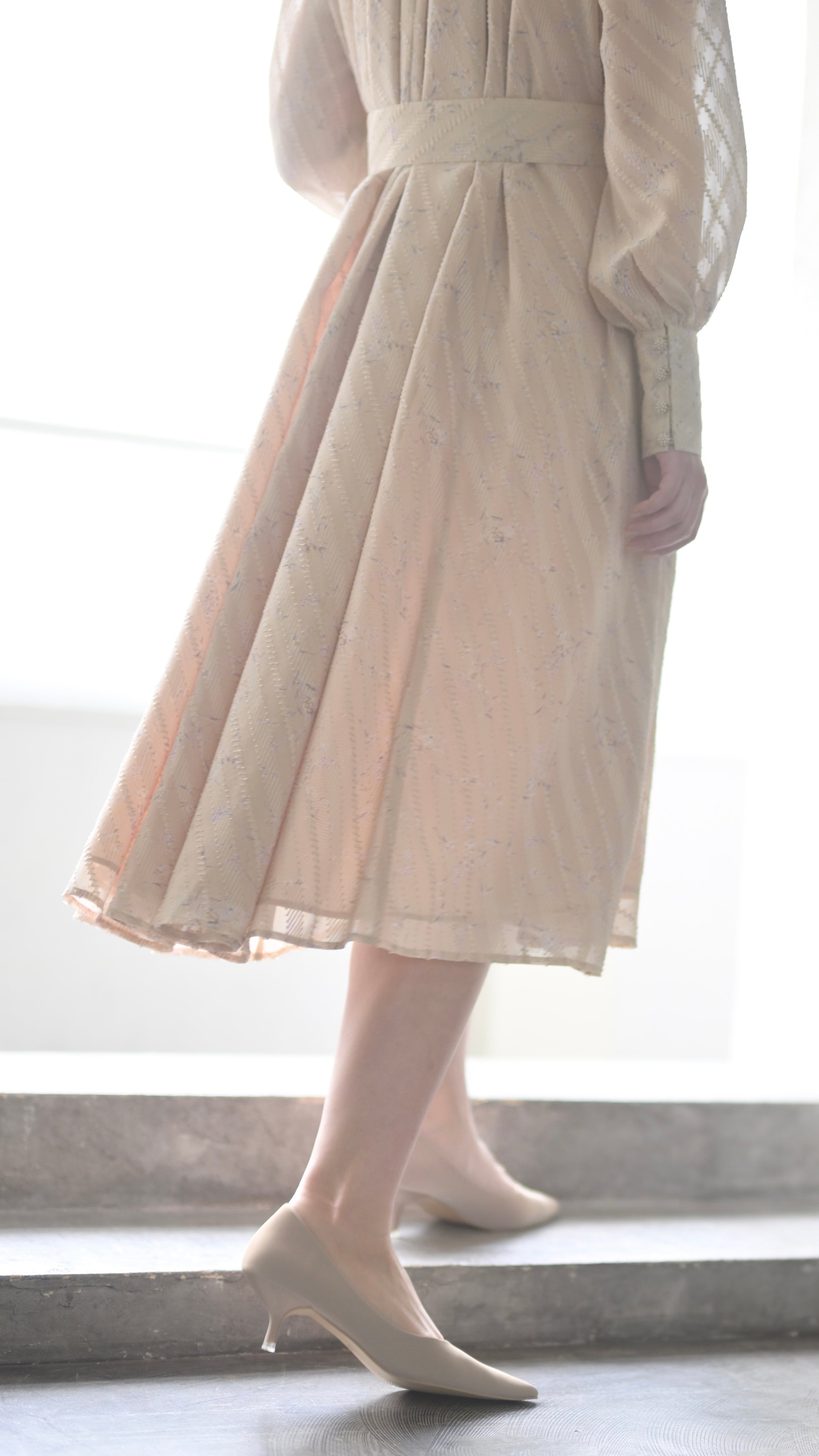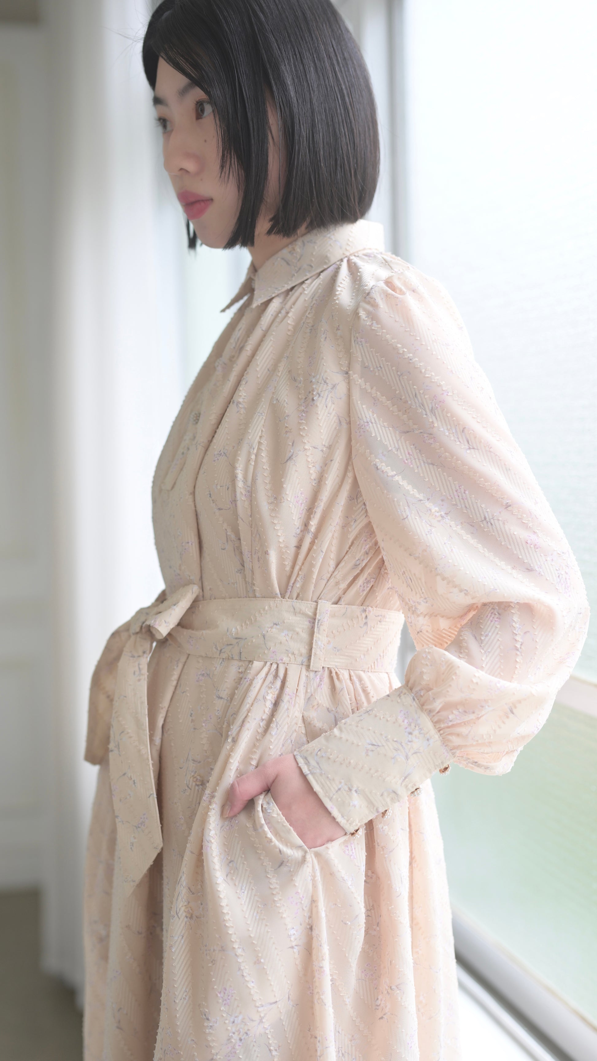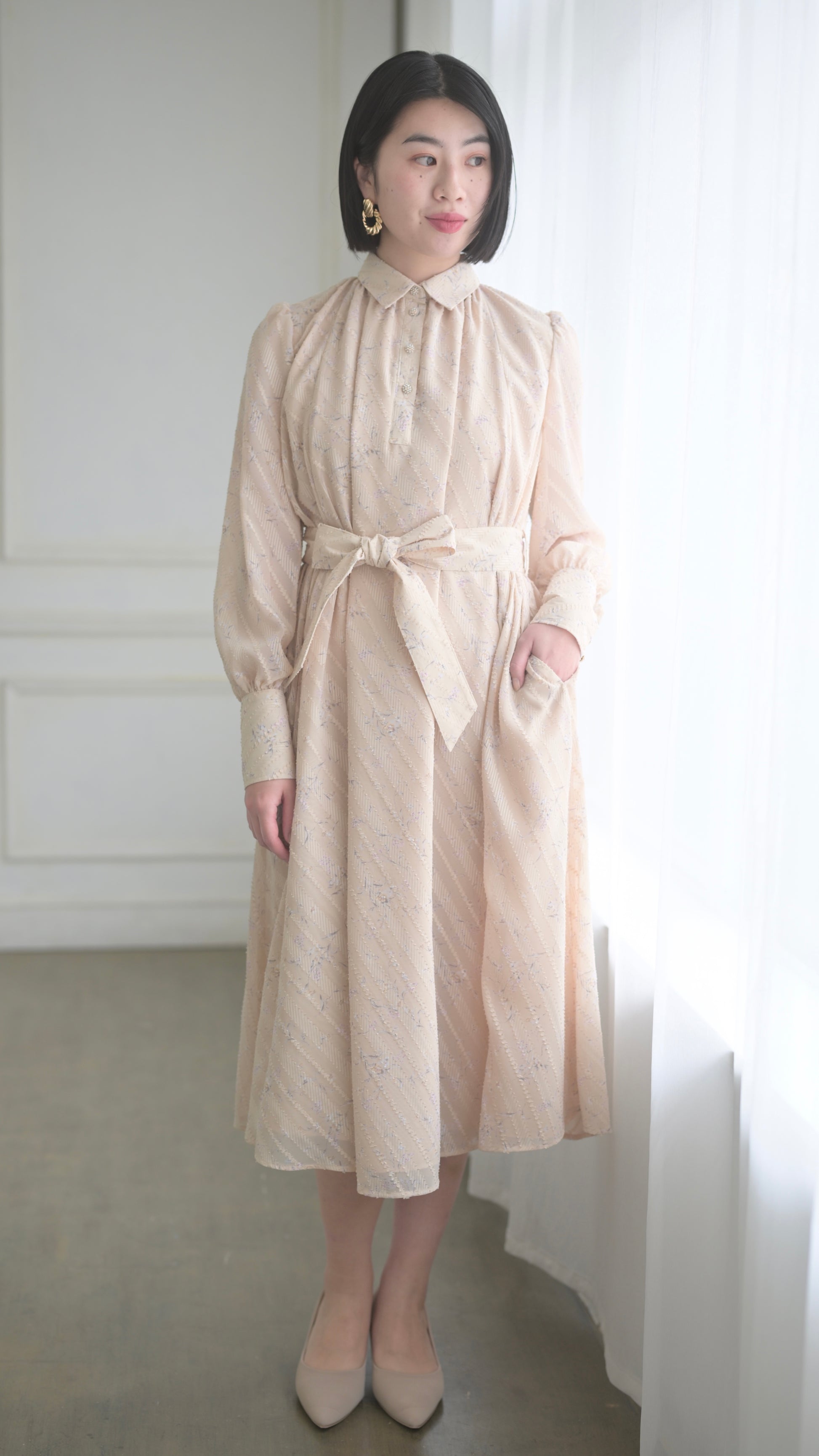 高級感のある拘りある生地だからこそ贅沢に生地を使用したデザインに、スカート部分のボリュームは裾幅一周約300cm使用し、襟のサイズ感、袖口のフワッとした仕様、ボタンの選別、バックスタイルも美しく見えるデザインになるよう細部にまでこだわったデザインでございます。袖部分の透け感のあるデザインが可愛いポイント。付属のベルトでぎゅっと縛って頂き如何にもエレガントを楽しむのもひとつ、ベルトを外してAラインスタイルでカジュアルに、ラフにもご着用頂けるワンピースドレスに仕上がっております。