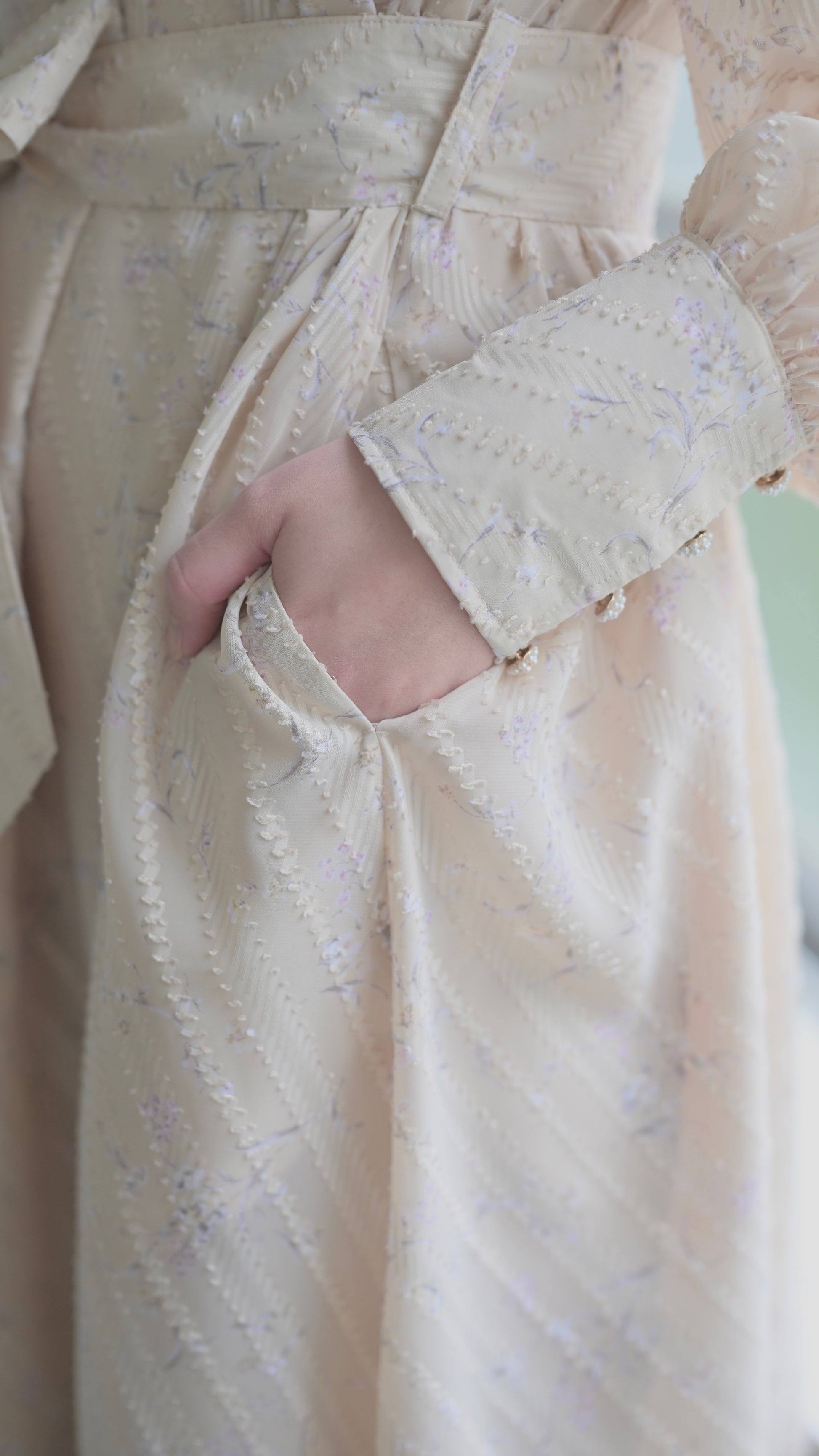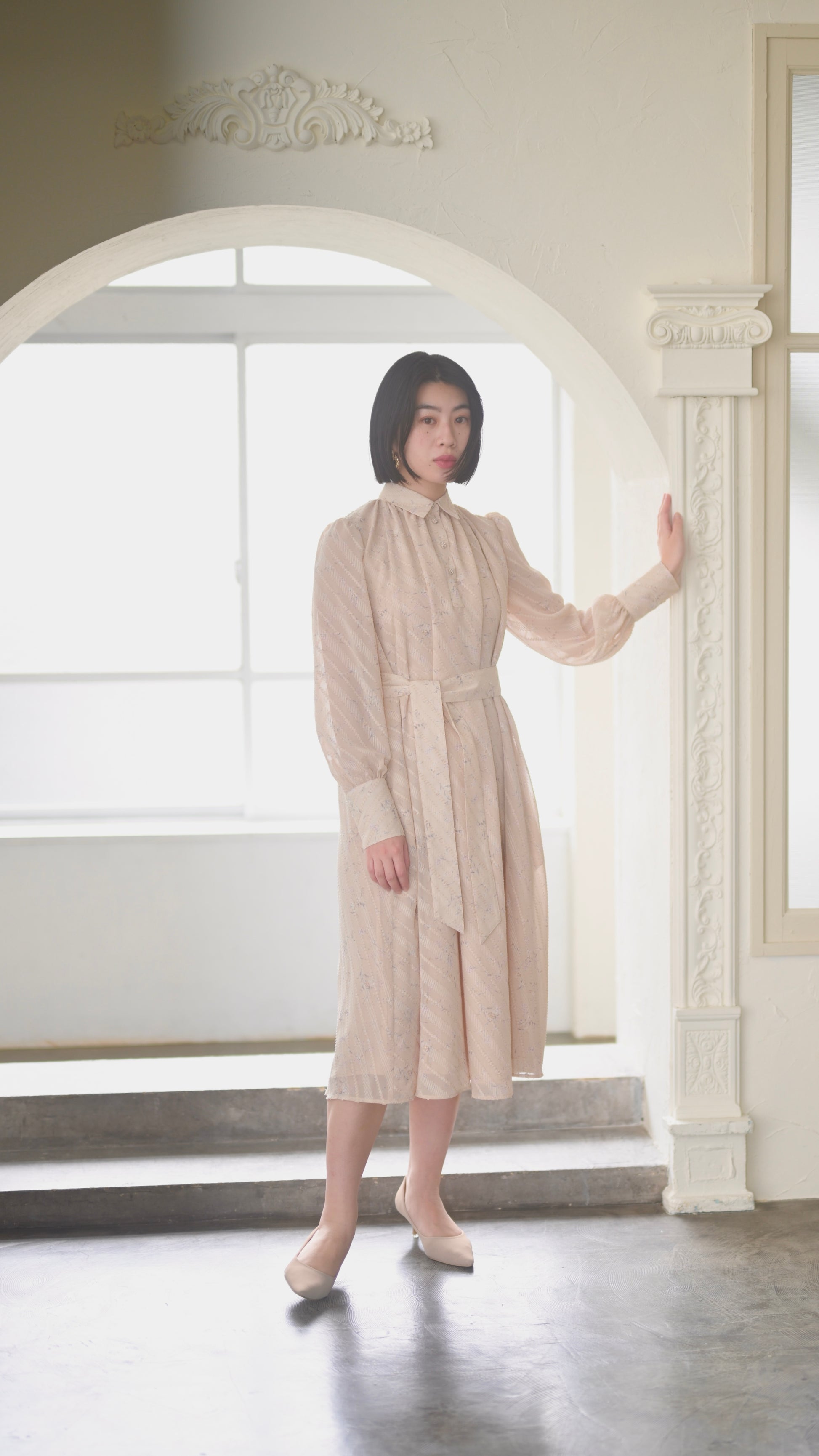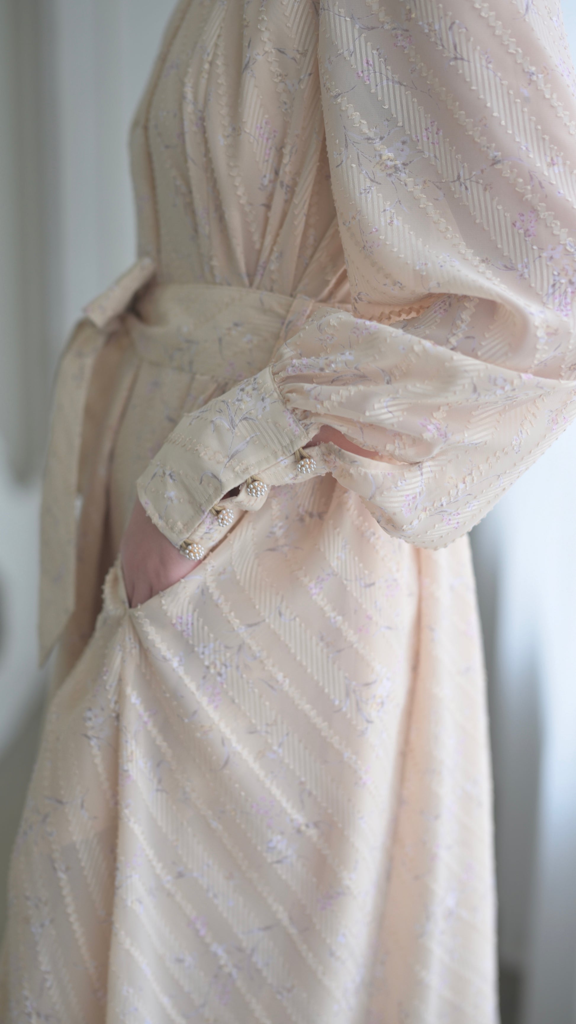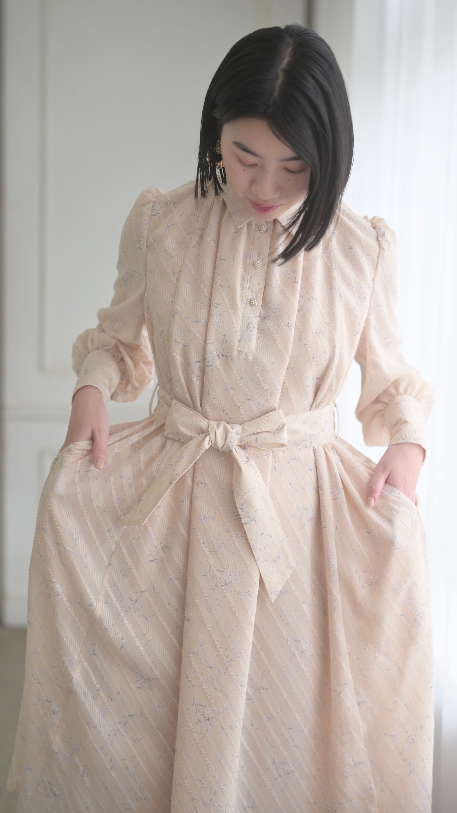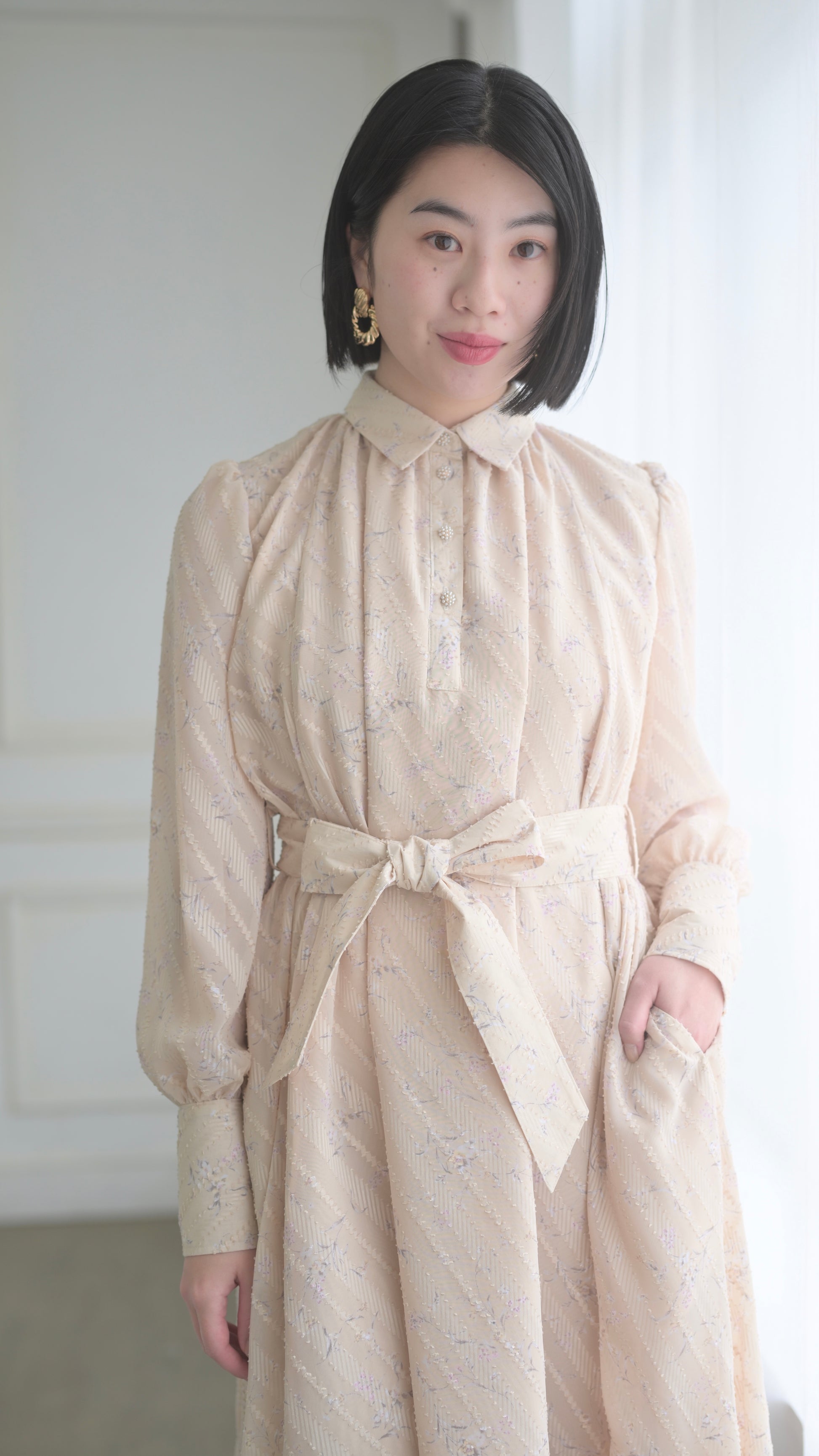 高級感のある拘りある生地だからこそ贅沢に生地を使用したデザインに、スカート部分のボリュームは裾幅一周約300cm使用し、襟のサイズ感、袖口のフワッとした仕様、ボタンの選別、バックスタイルも美しく見えるデザインになるよう細部にまでこだわったデザインでございます。袖部分の透け感のあるデザインが可愛いポイント。付属のベルトでぎゅっと縛って頂き如何にもエレガントを楽しむのもひとつ、ベルトを外してAラインスタイルでカジュアルに、ラフにもご着用頂けるワンピースドレスに仕上がっております。
