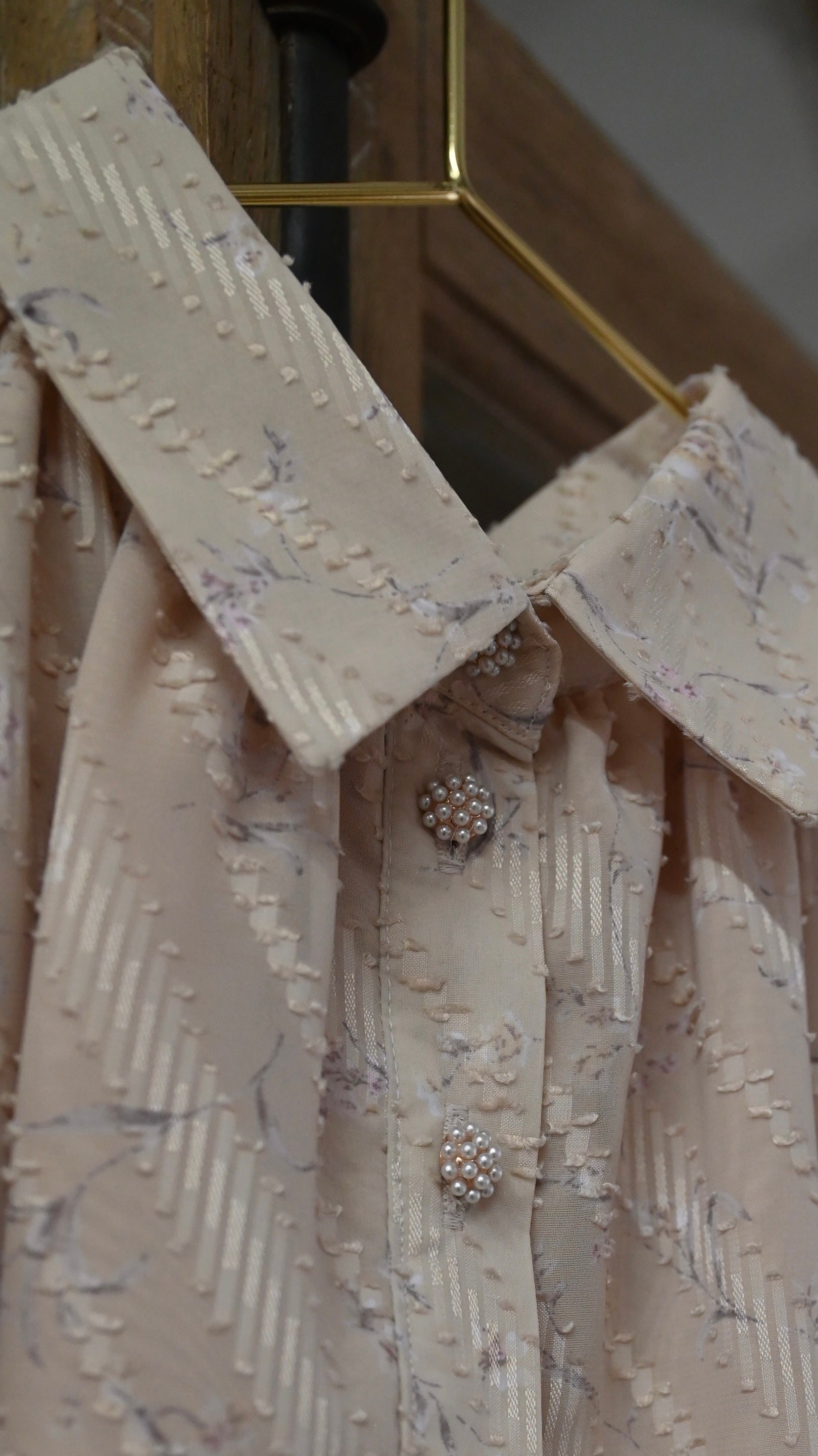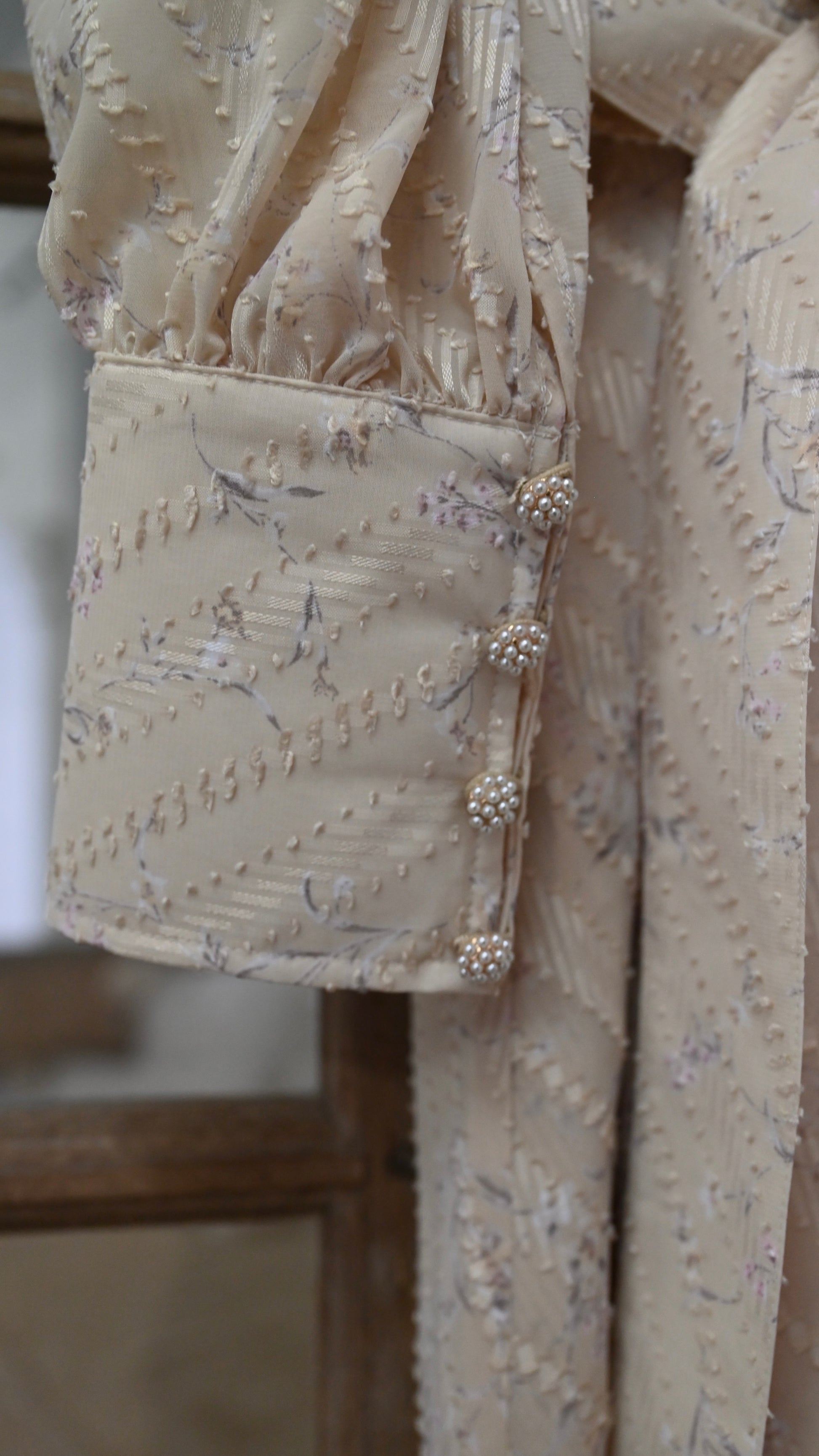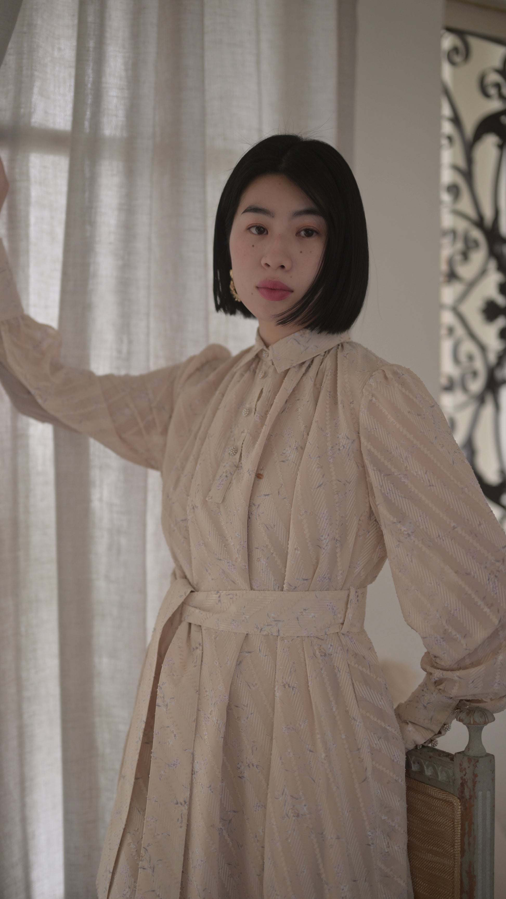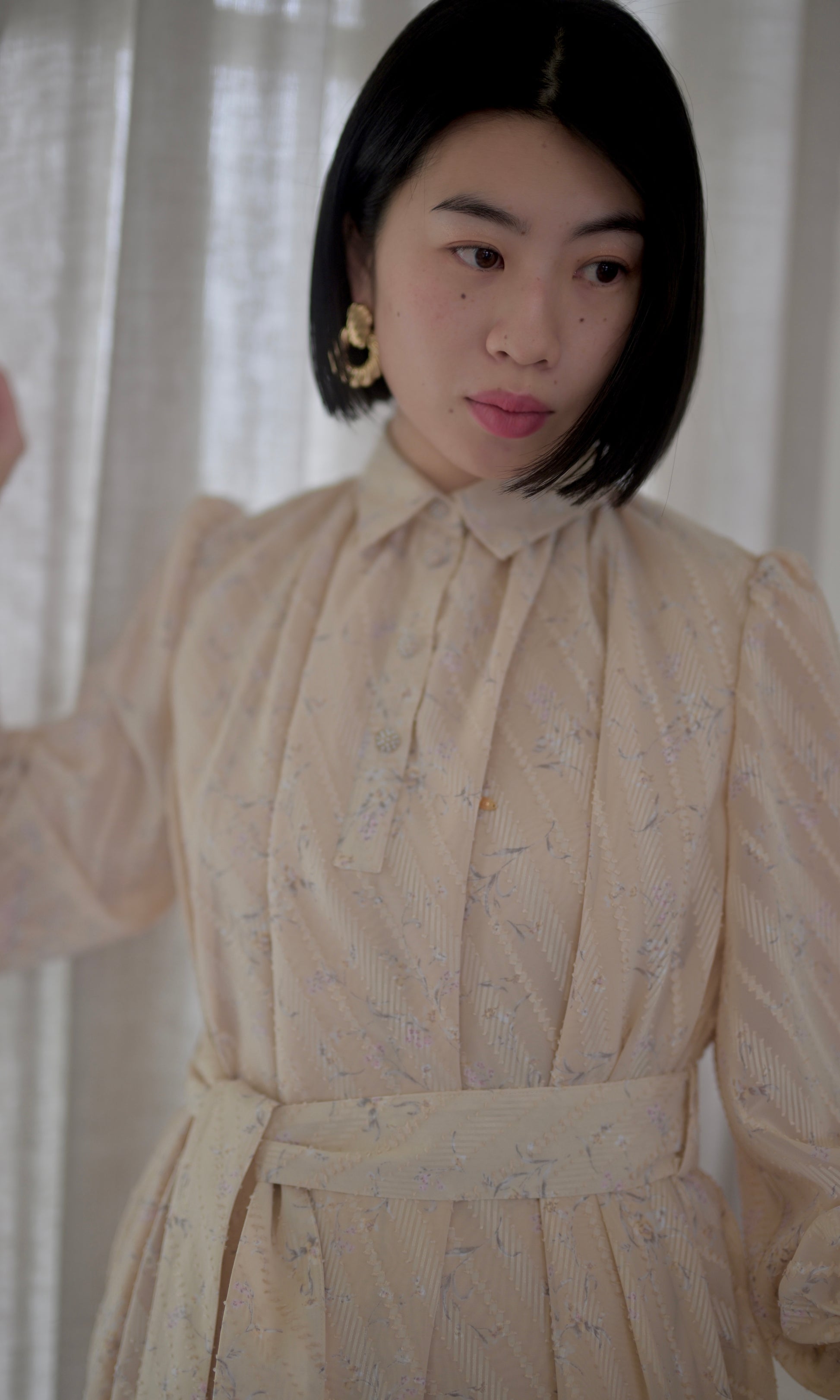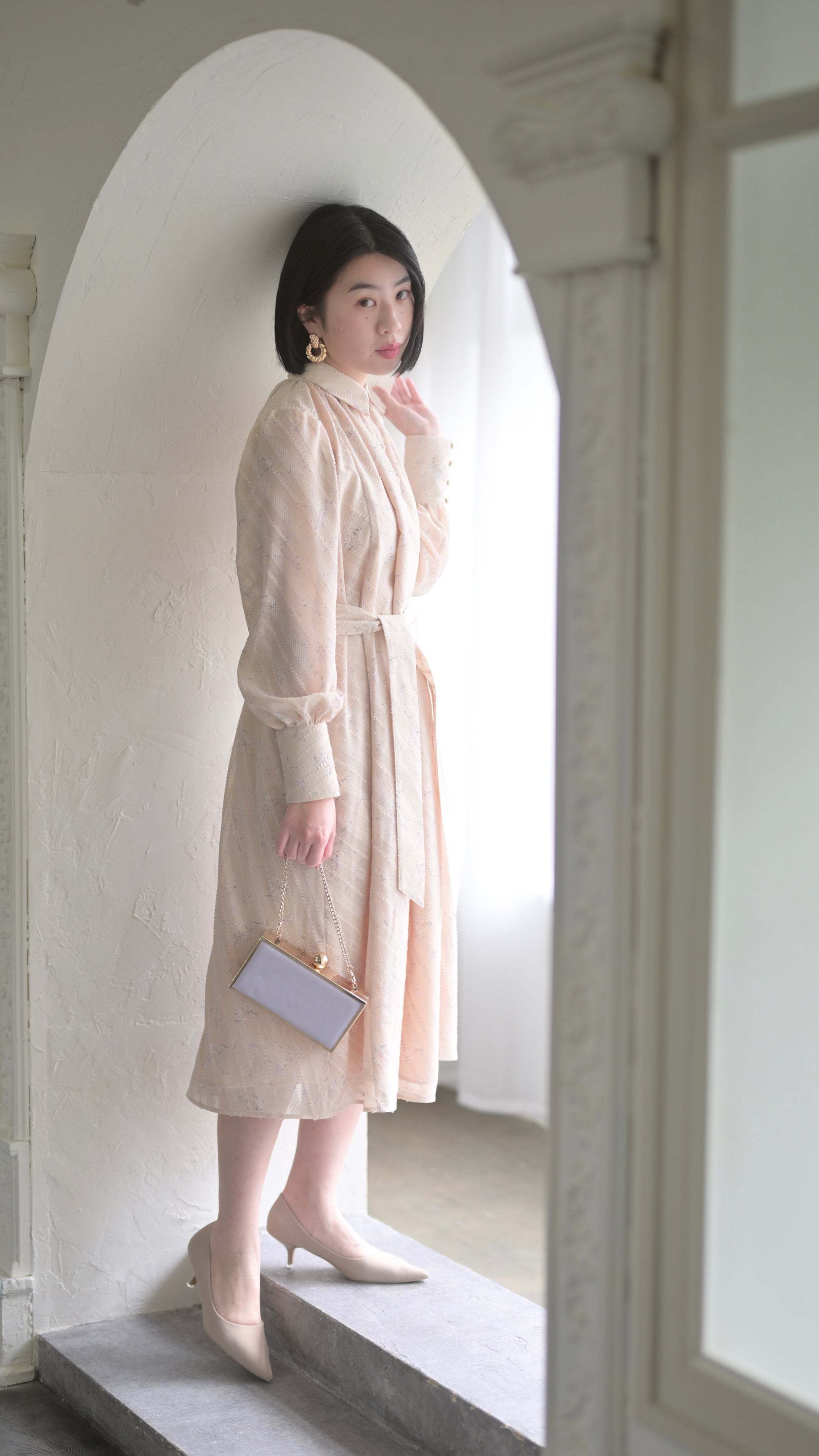 高級感のある拘りある生地だからこそ贅沢に生地を使用したデザインに、スカート部分のボリュームは裾幅一周約300cm使用し、襟のサイズ感、袖口のフワッとした仕様、ボタンの選別、バックスタイルも美しく見えるデザインになるよう細部にまでこだわったデザインでございます。袖部分の透け感のあるデザインが可愛いポイント。付属のベルトでぎゅっと縛って頂き如何にもエレガントを楽しむのもひとつ、ベルトを外してAラインスタイルでカジュアルに、ラフにもご着用頂けるワンピースドレスに仕上がっております。