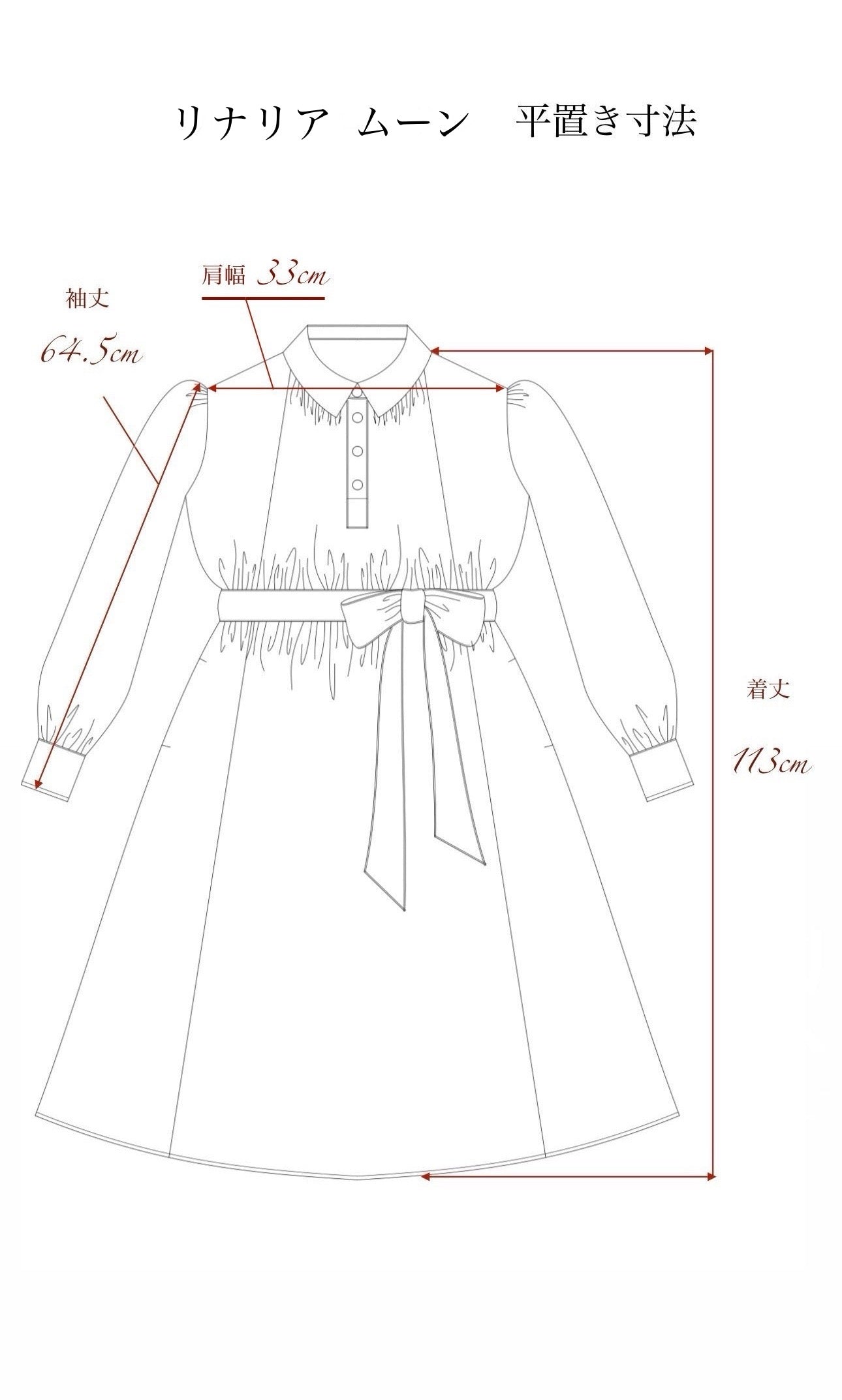 ※リナリアムーンのワンピースはベルトを外していただくとAラインになったデザインとなっております為、バスト・ウエストは広い仕様になっており、寸法記載は省略しております。