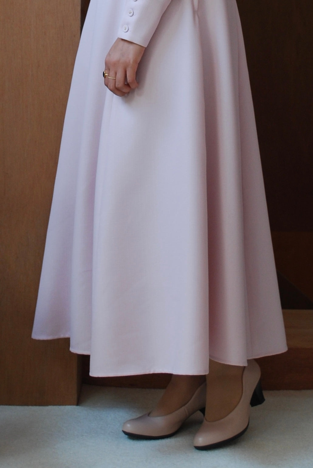 締め付けのないようボディラインに添ったウエストまわりのシルエットは