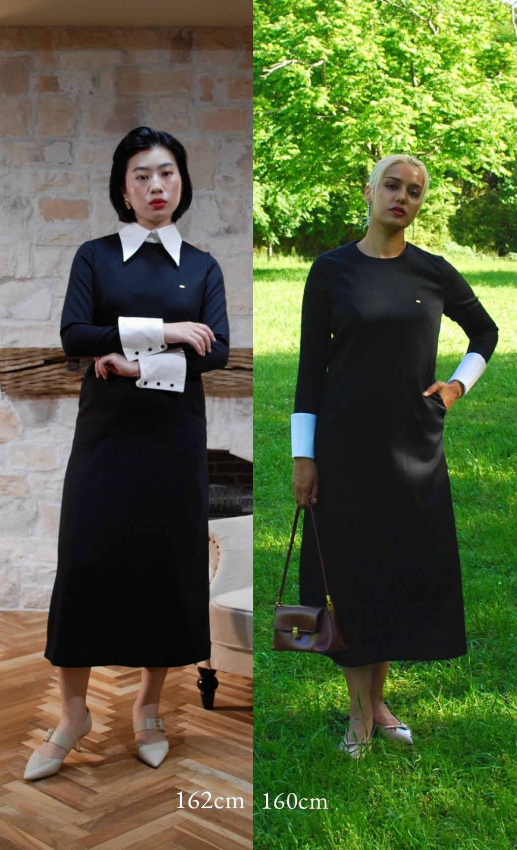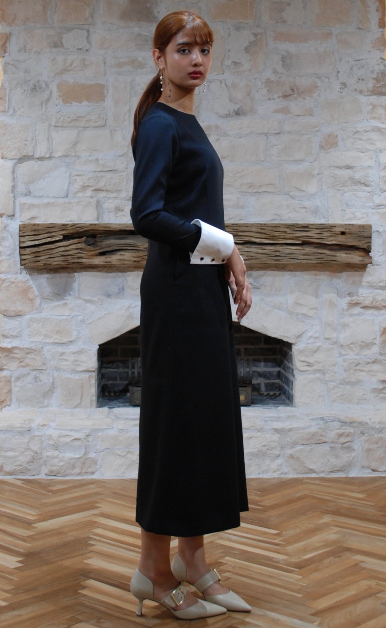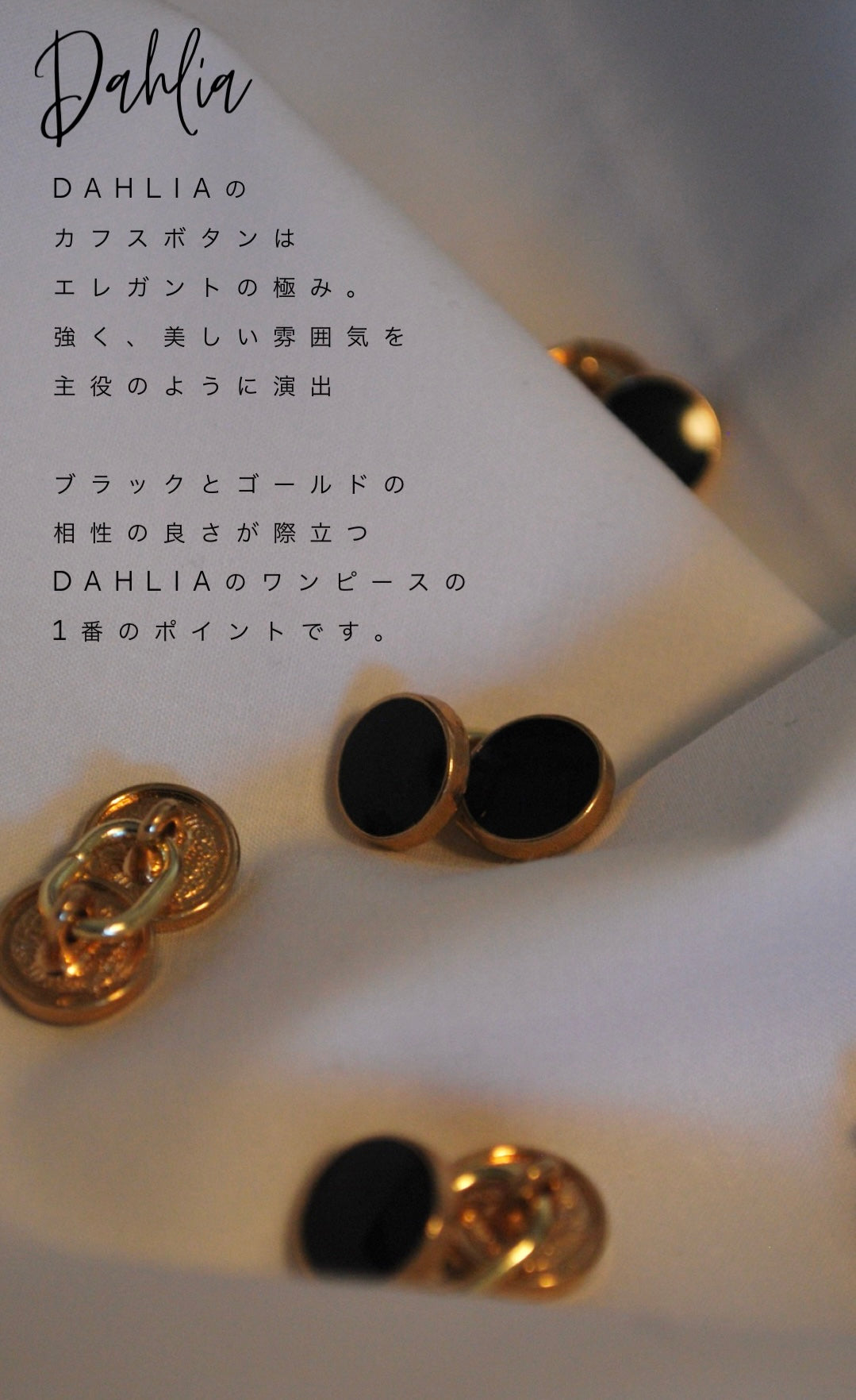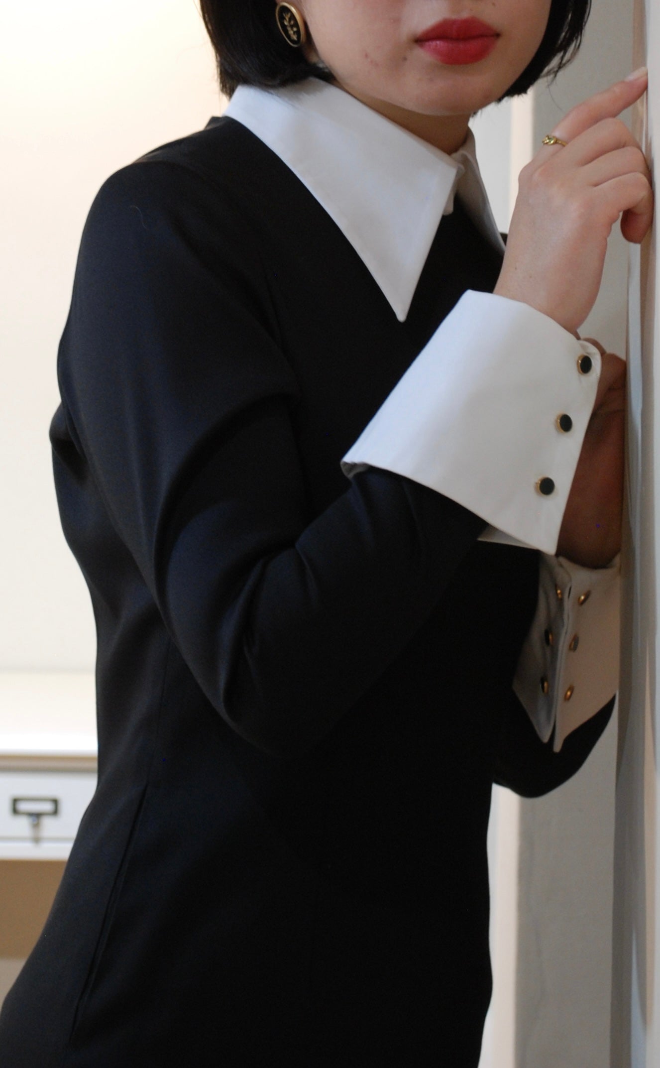 カフスだけを付けたり、襟だけを付けたり、どちらも付けてロイヤルでレトロなかっこいい雰囲気にしたりと、マルチに活躍できる万能なワンピース。