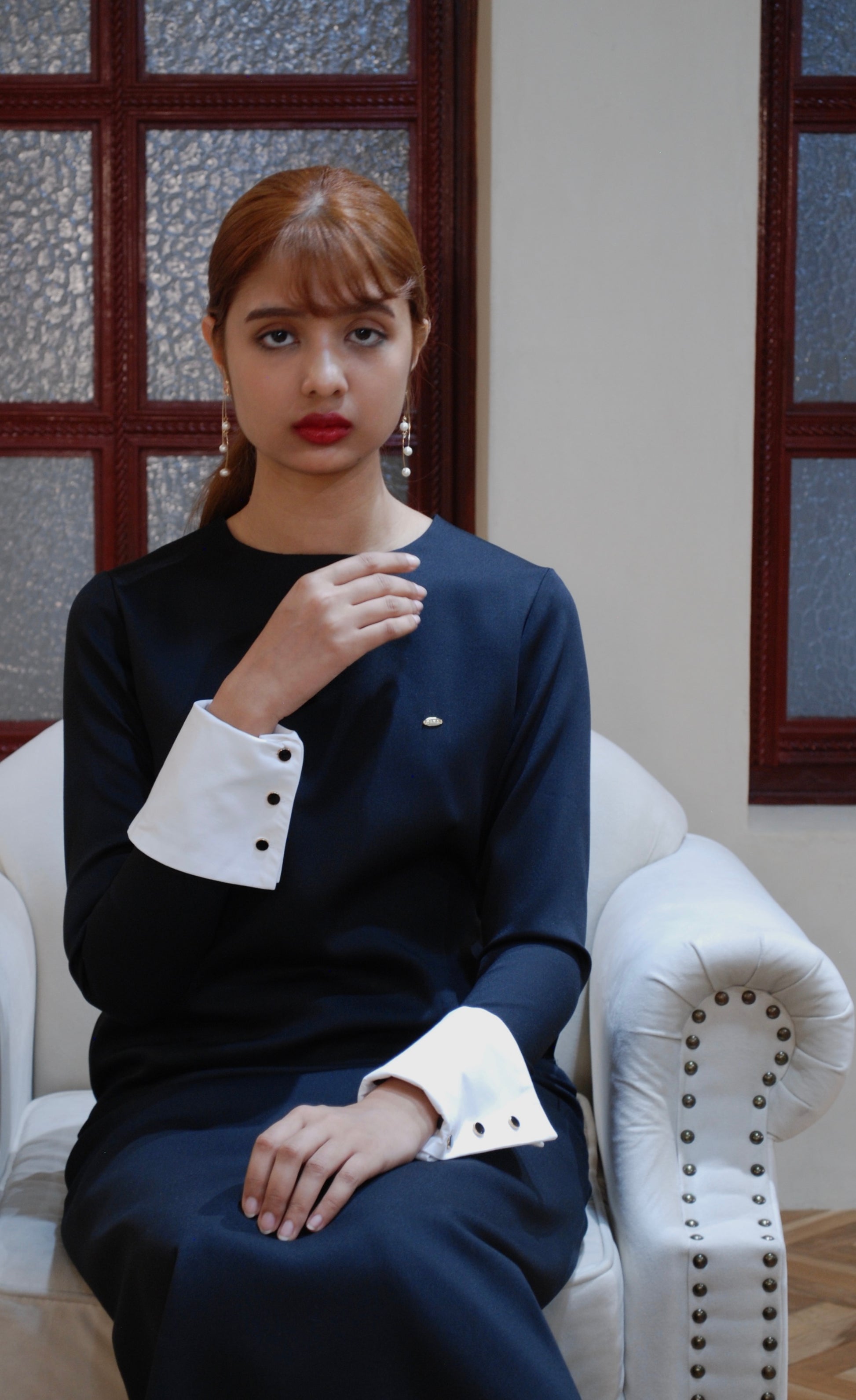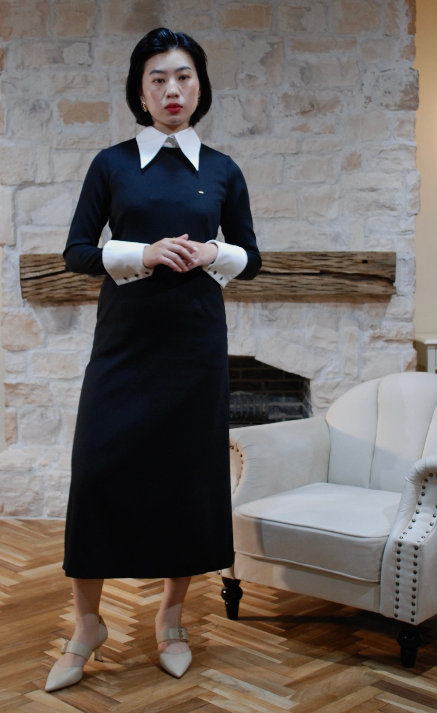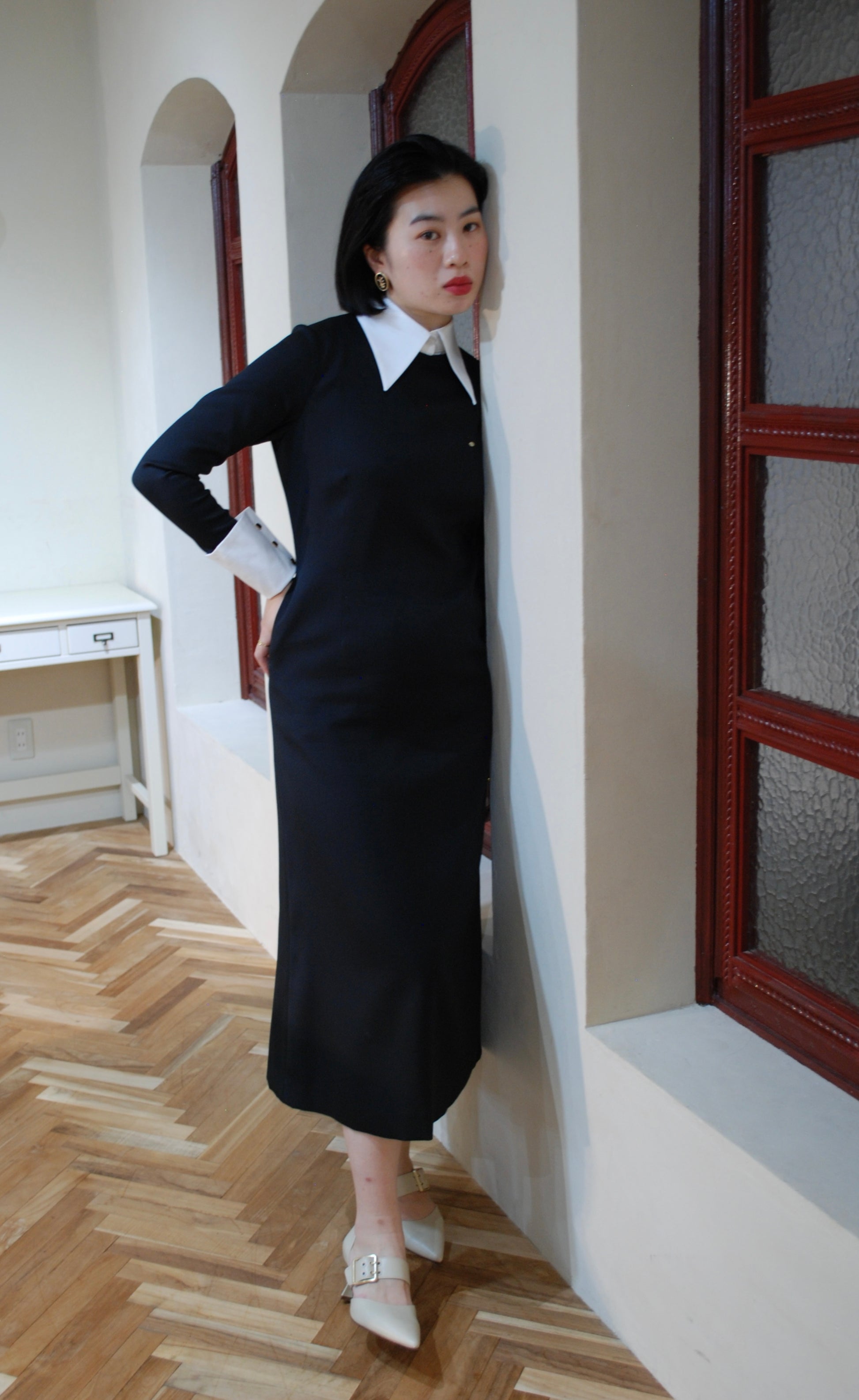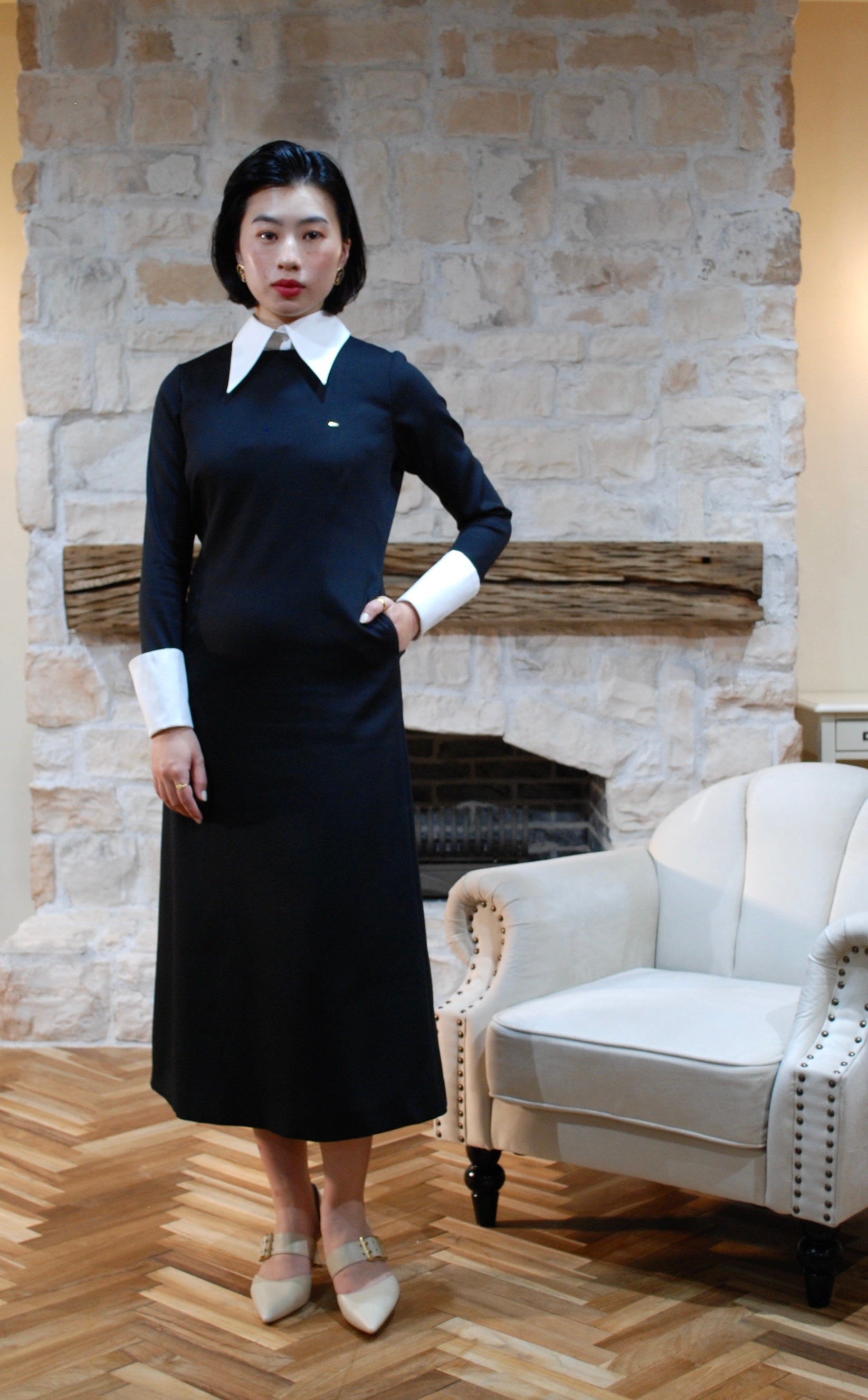 カフスだけを付けたり、襟だけを付けたり、どちらも付けてロイヤルでレトロなかっこいい雰囲気にしたりと、マルチに活躍できる万能なワンピース。
