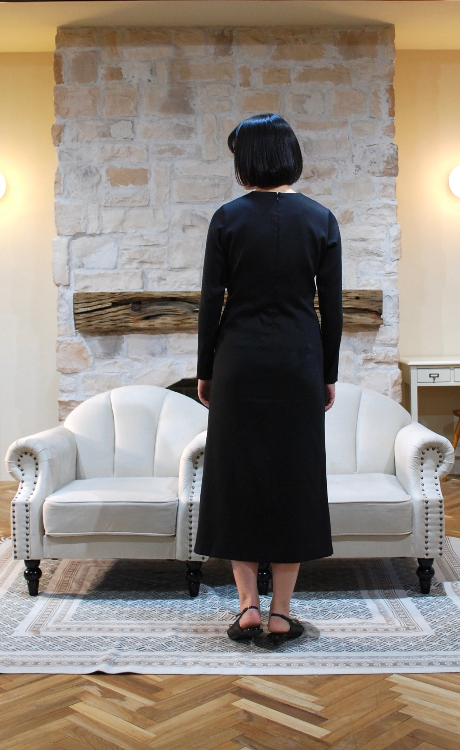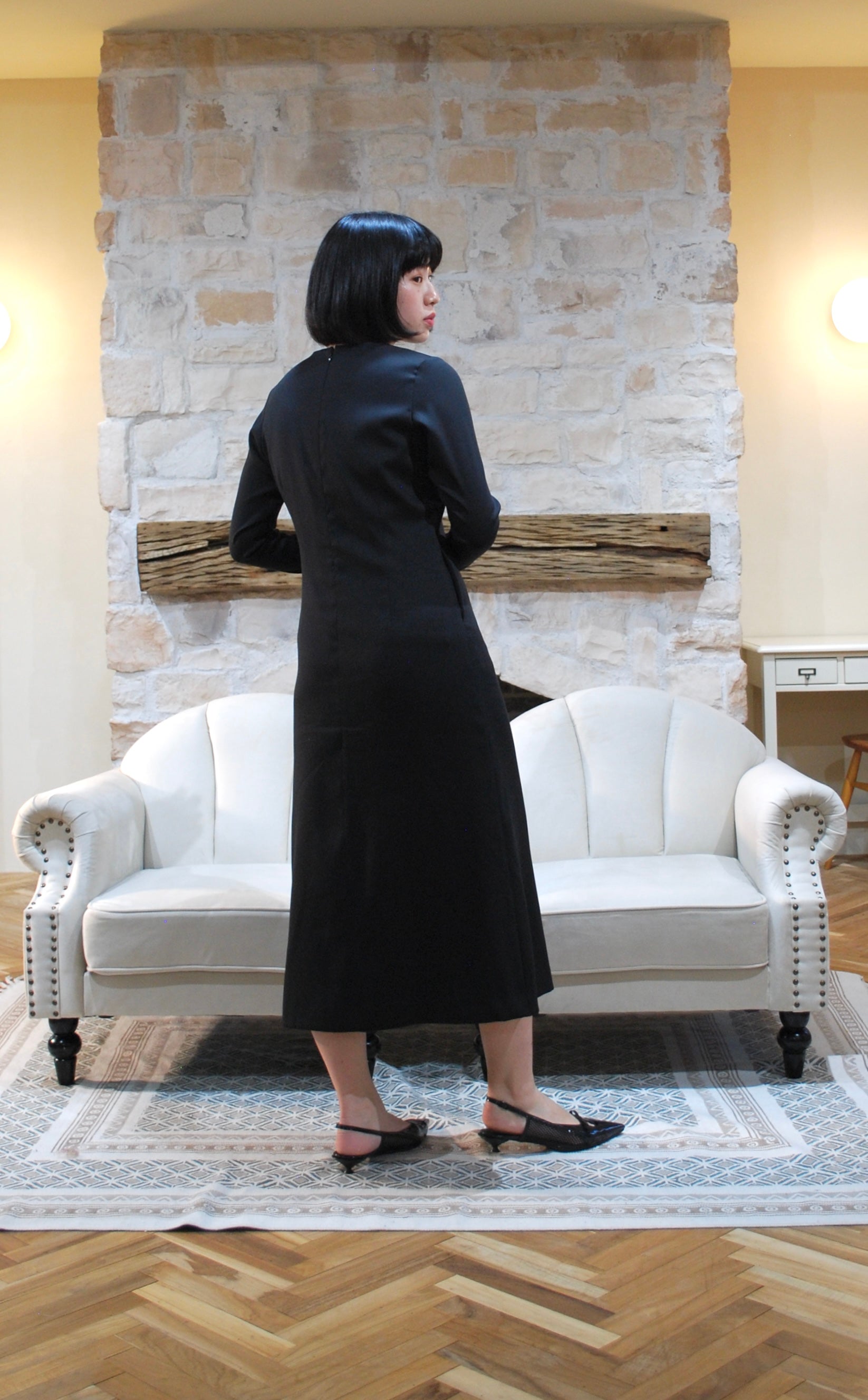 ブラックのシンプルで美しいワンピースのボディラインは強く美しい花のダリアそのもの。