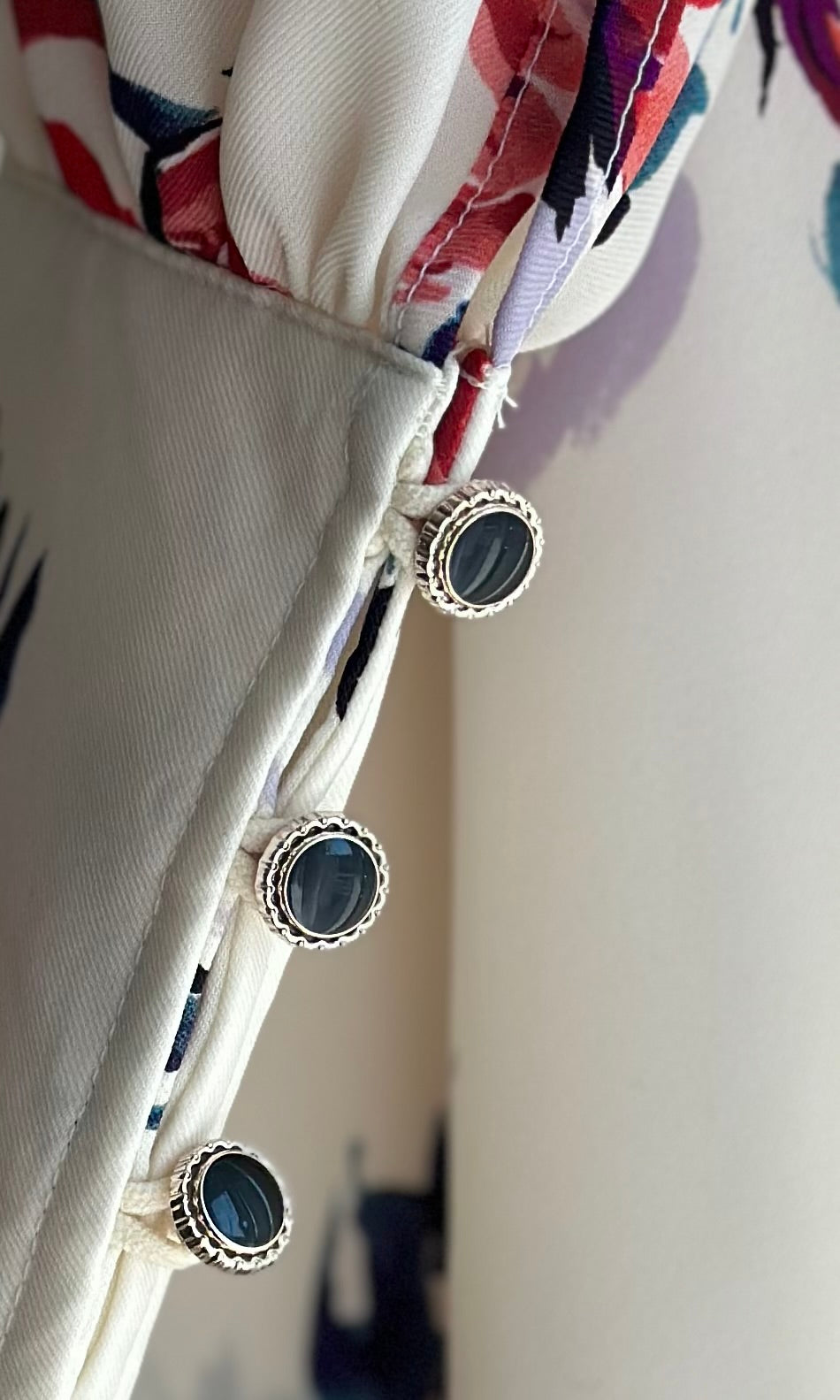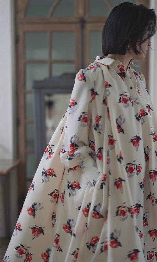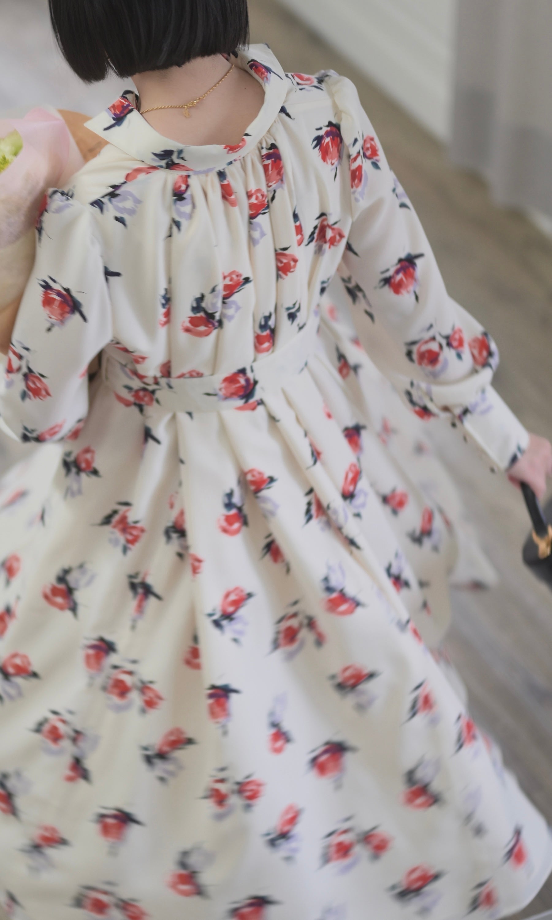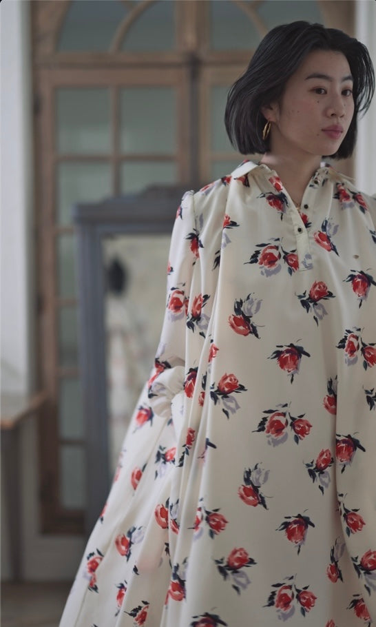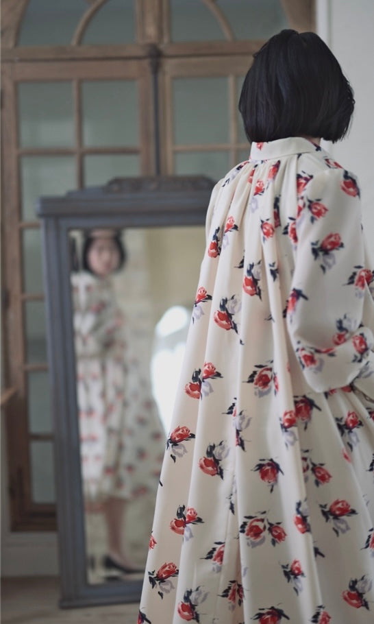 肌触りの良い優しい素材感は勿論のこと、スカート部分は贅沢なボリュームで裾幅一周約300cm使用し、襟のサイズ感、袖口のフワッとした仕様、ボタンの選別、バックスタイルも美しく見えるデザインになるよう細部にまでこだわったデザインでございます。