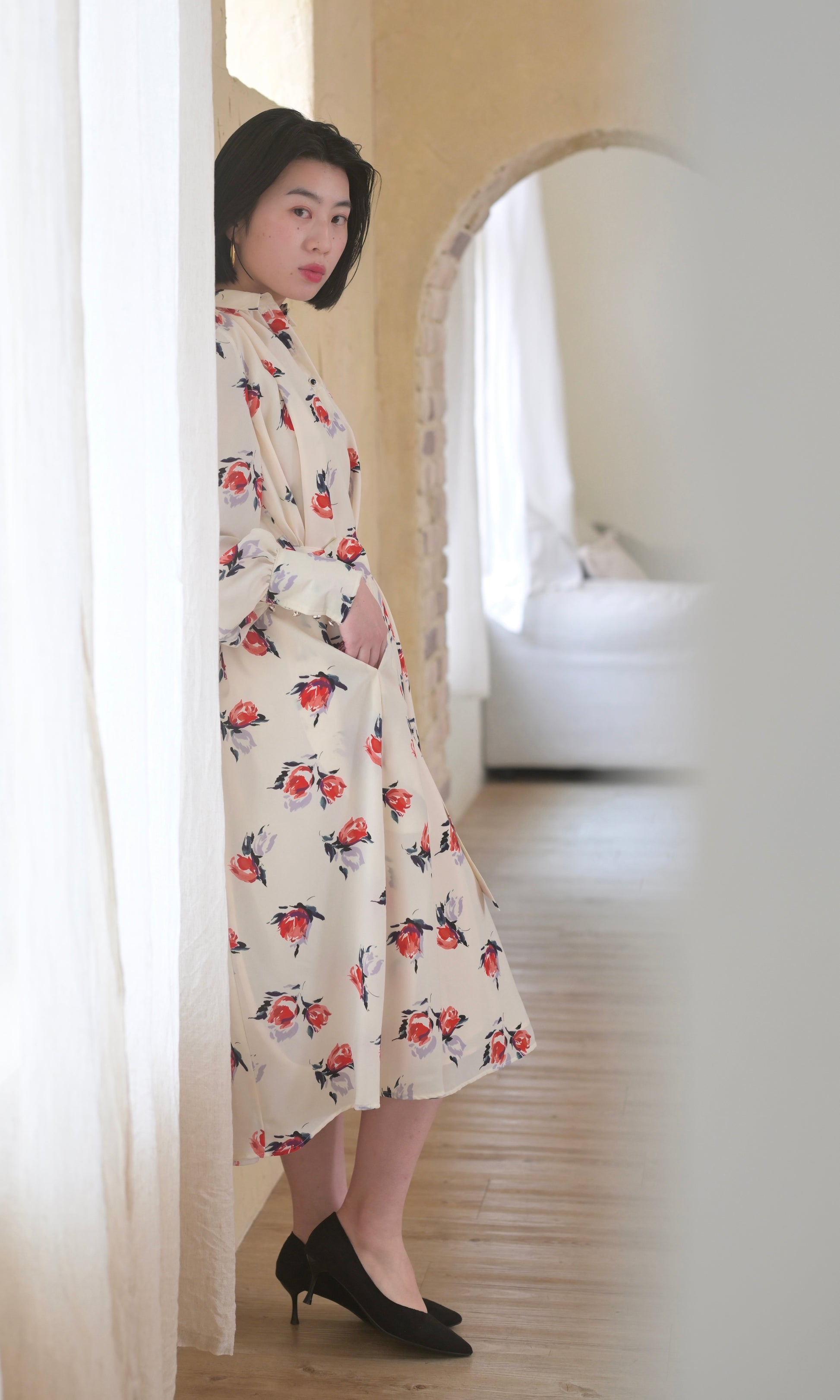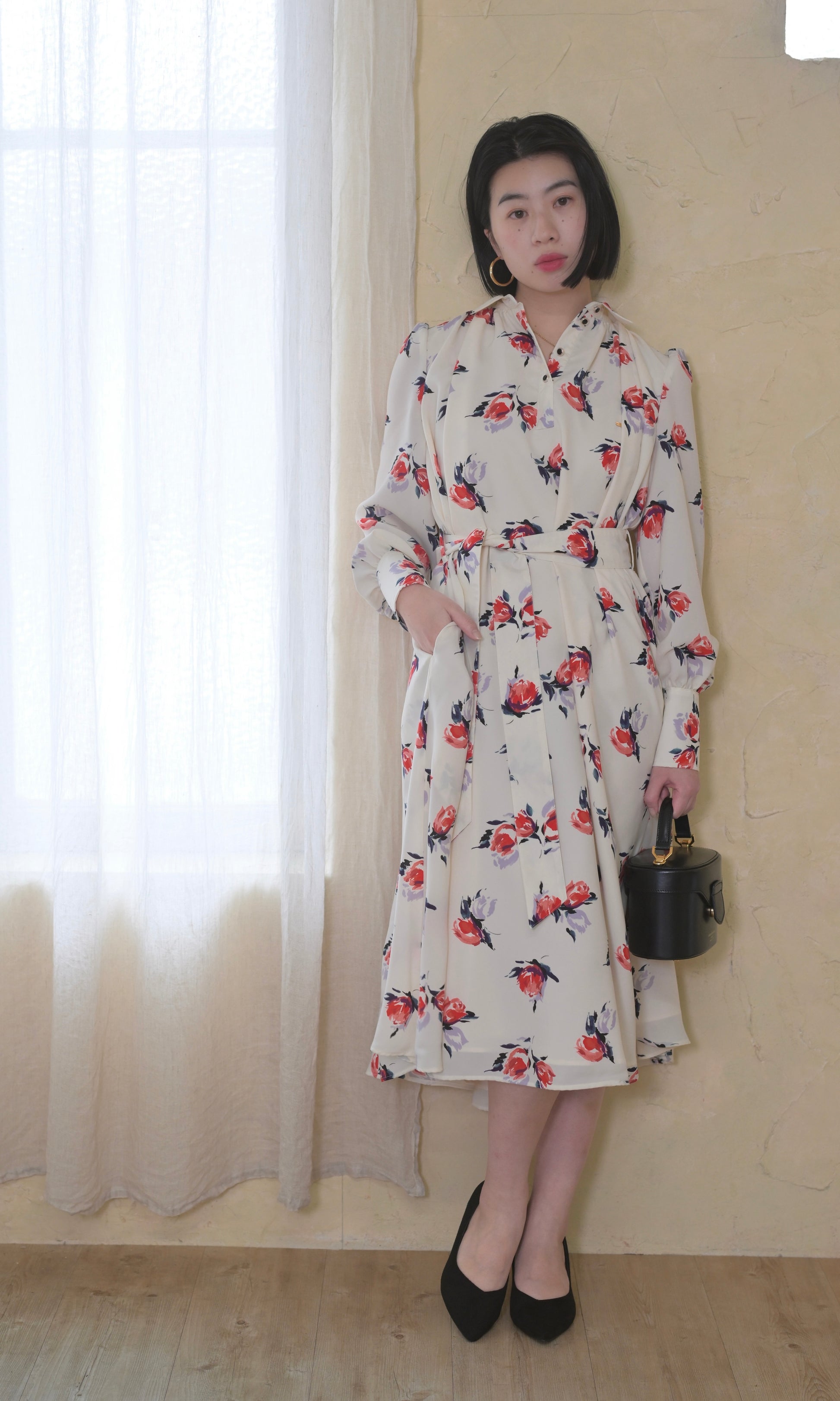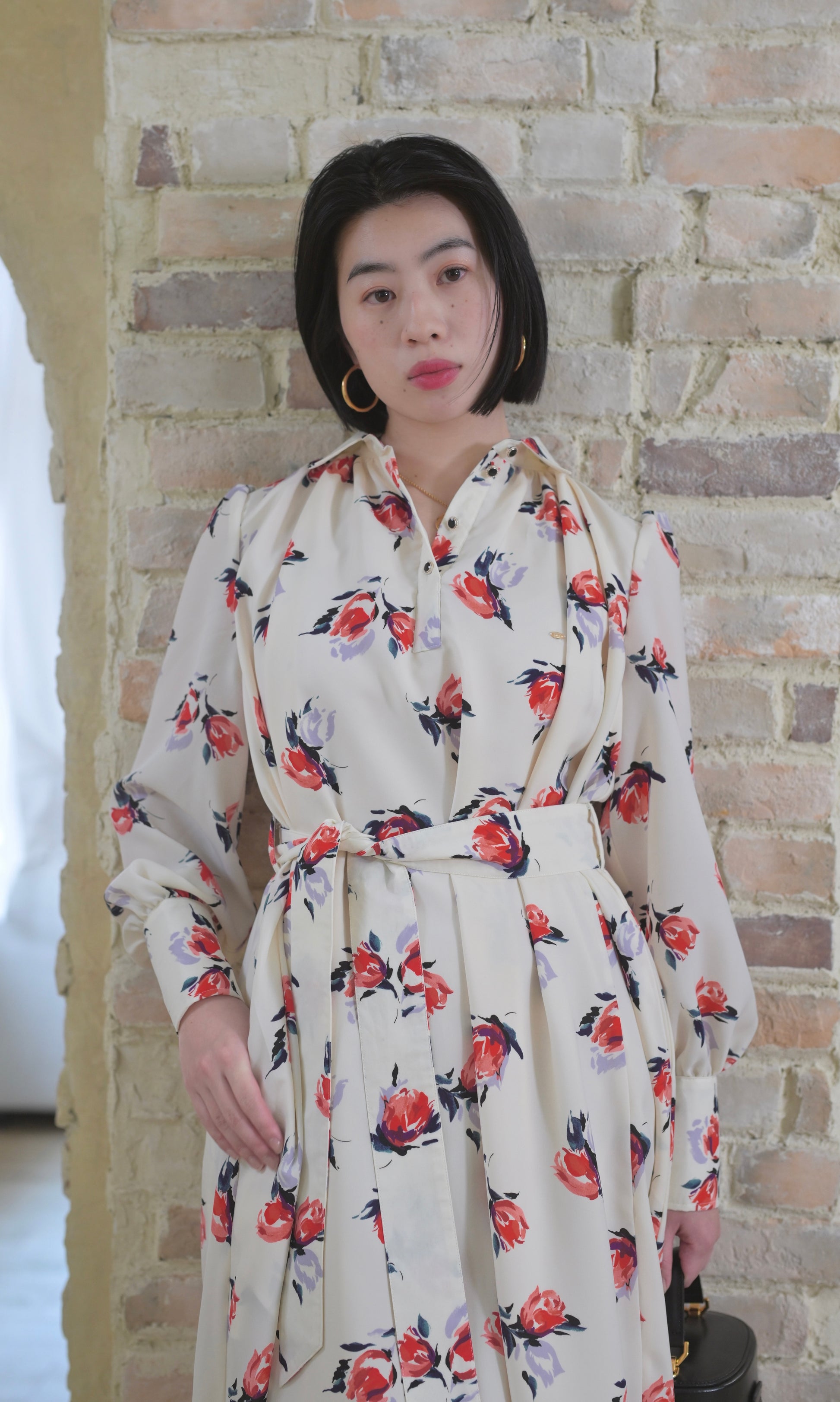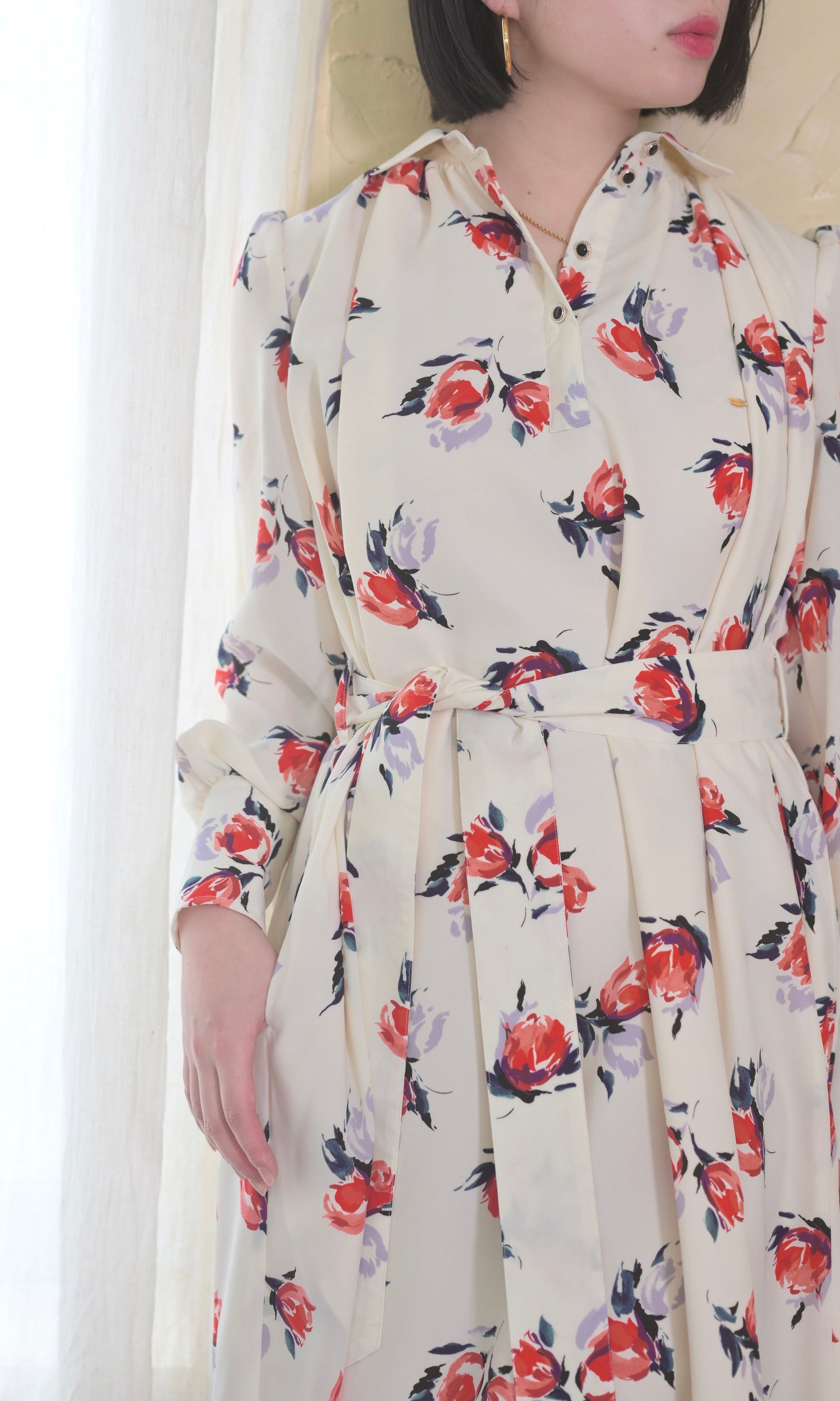 『深紅のルビーの花は華やかな美しさで見る人を魅了する』ルビーという色に込められた情熱、愛情、勝利、生命力は、ルビーフローラルの花柄そのもの。大花すぎず丁度良いサイズ感のルビー色の花柄と優しい雰囲気のホワイトベースの色味の組み合わせは、華やかでありながらも清楚さ、気品さ、エレガントさのバランスが良く大人の花柄ワンピースとして外出を楽しませてくれます。