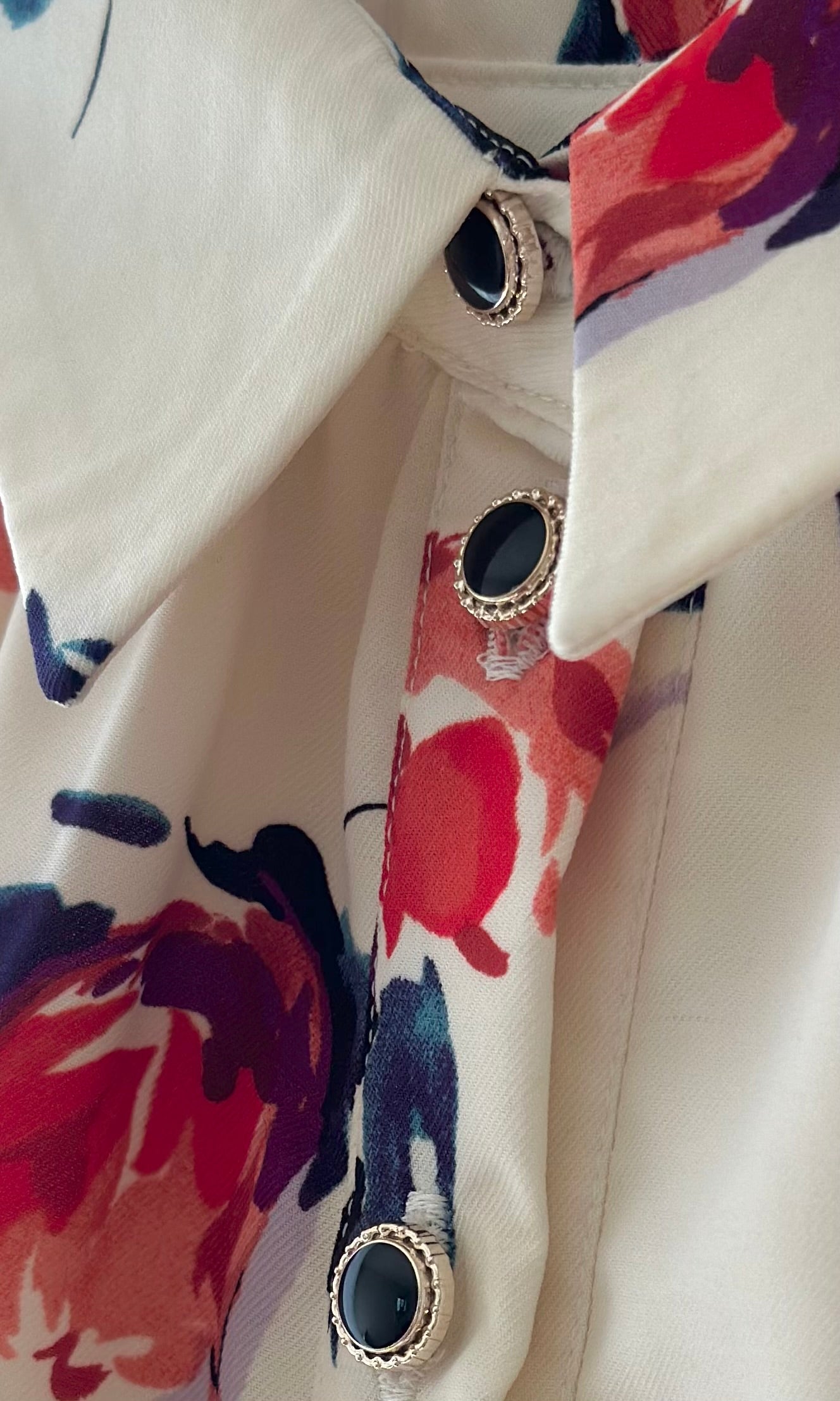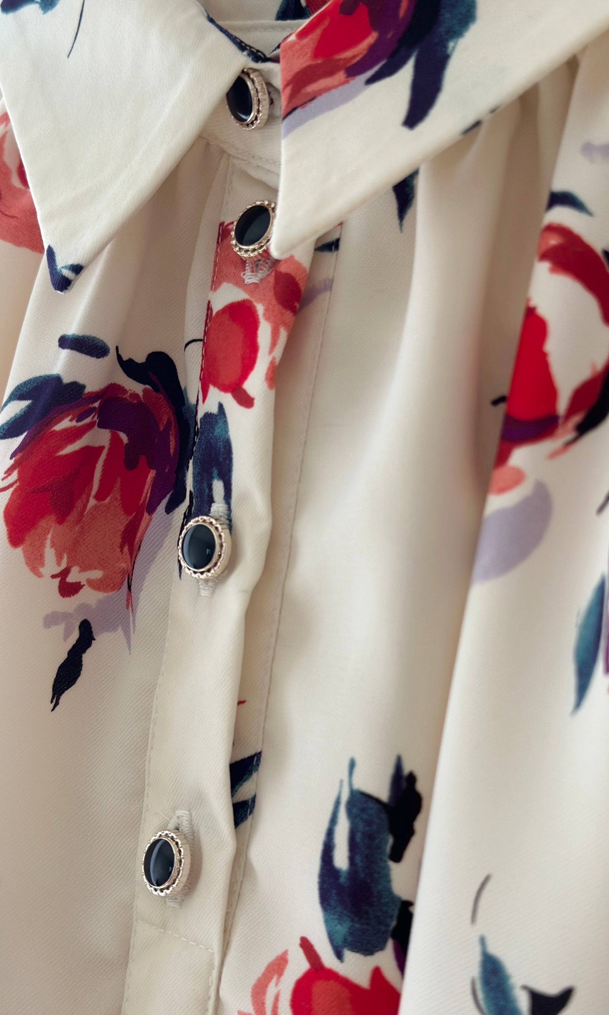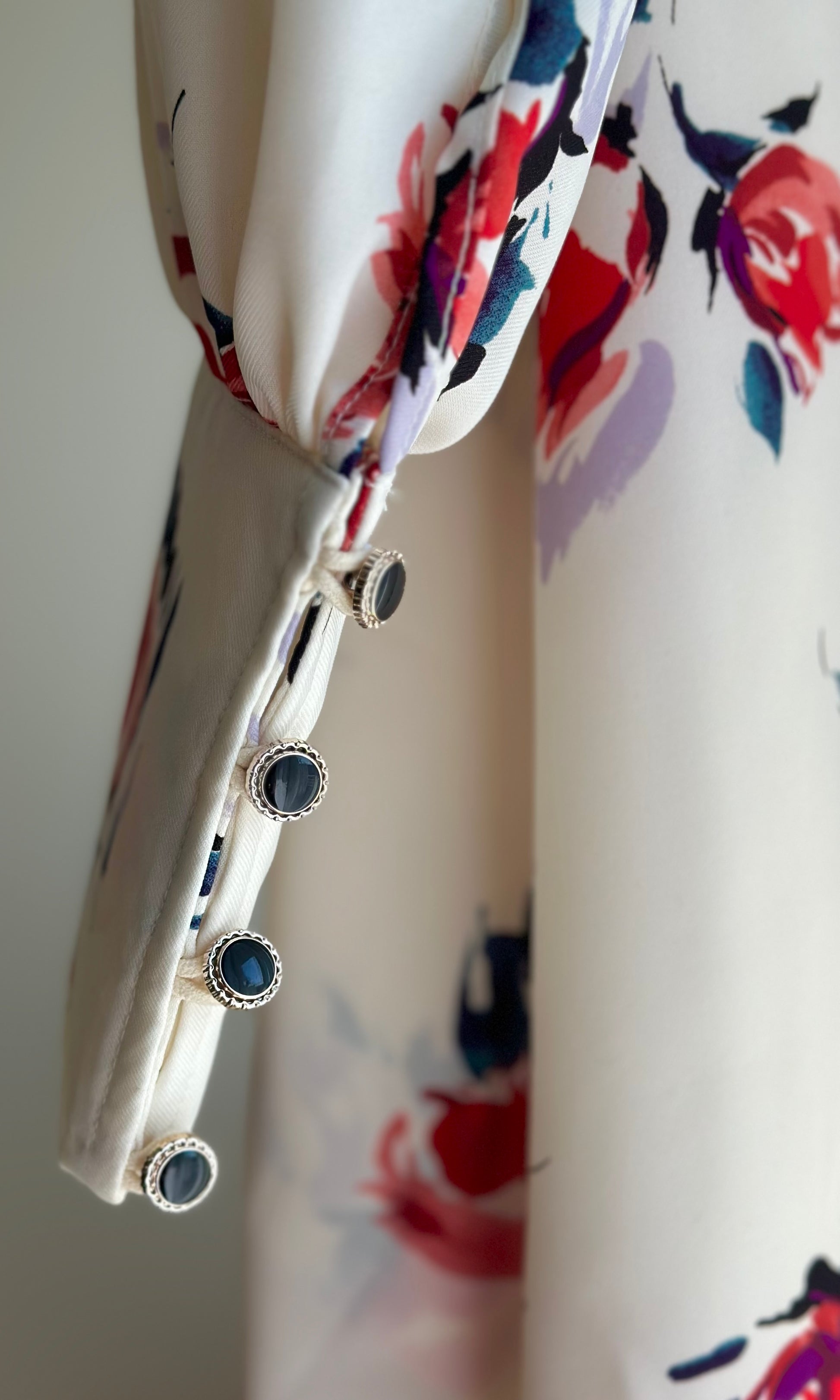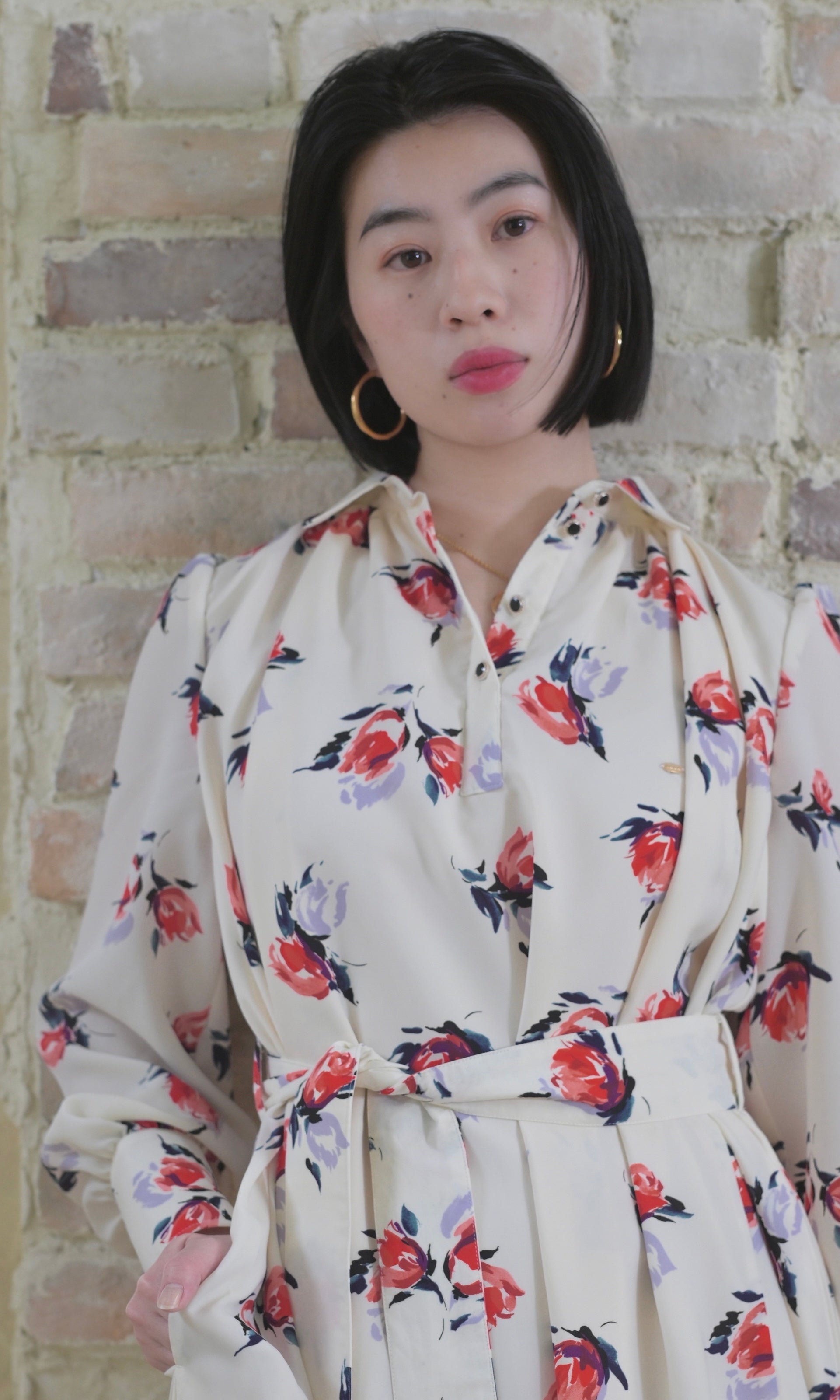 『深紅のルビーの花は華やかな美しさで見る人を魅了する』ルビーという色に込められた情熱、愛情、勝利、生命力は、ルビーフローラルの花柄そのもの。大花すぎず丁度良いサイズ感のルビー色の花柄と優しい雰囲気のホワイトベースの色味の組み合わせは、華やかでありながらも清楚さ、気品さ、エレガントさのバランスが良く大人の花柄ワンピースとして外出を楽しませてくれます。