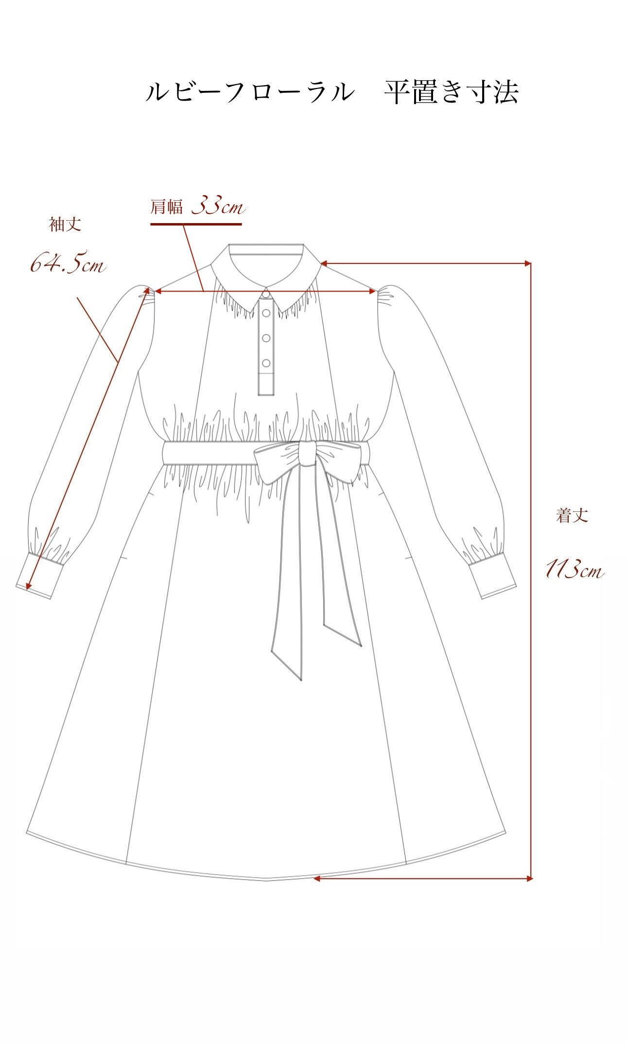 ※ルビーフローラルのワンピースはベルトを外していただくとAラインになったデザインとなっております為、バスト・ウエストは広い仕様になっており、寸法記載は省略しております。